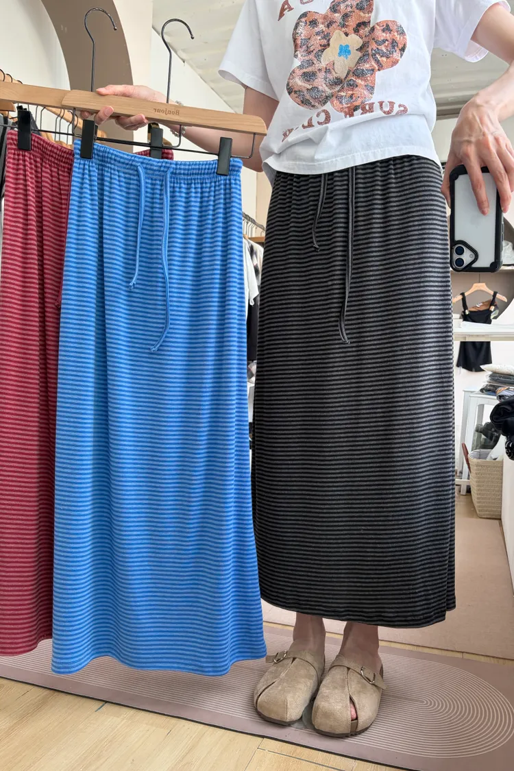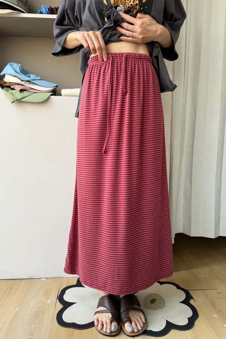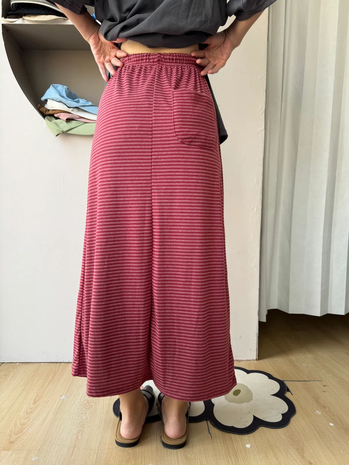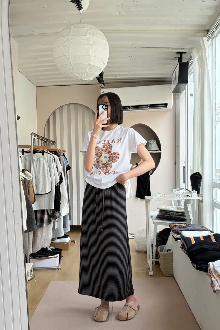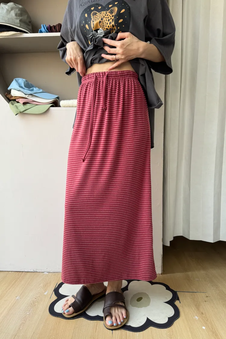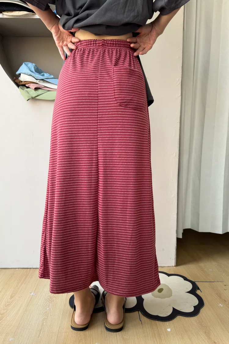 鬆緊腰+細條紋設計讓整體很輕鬆,穿起來有一點日系慵懶味。