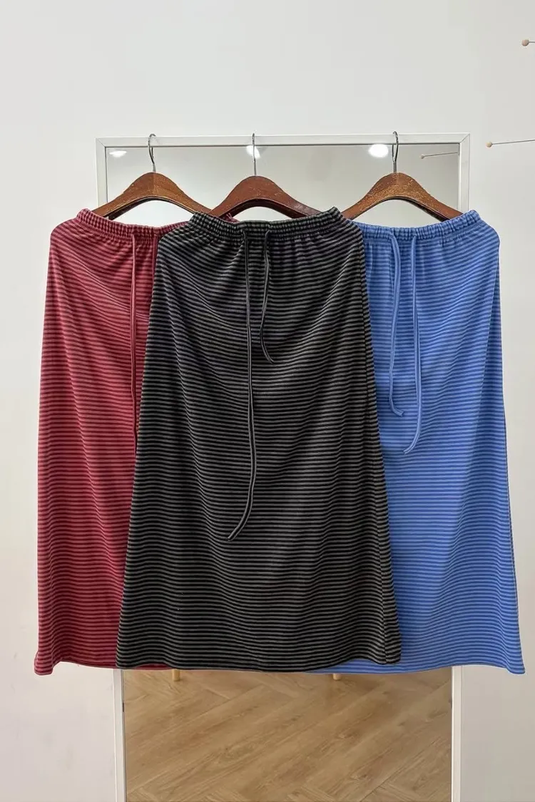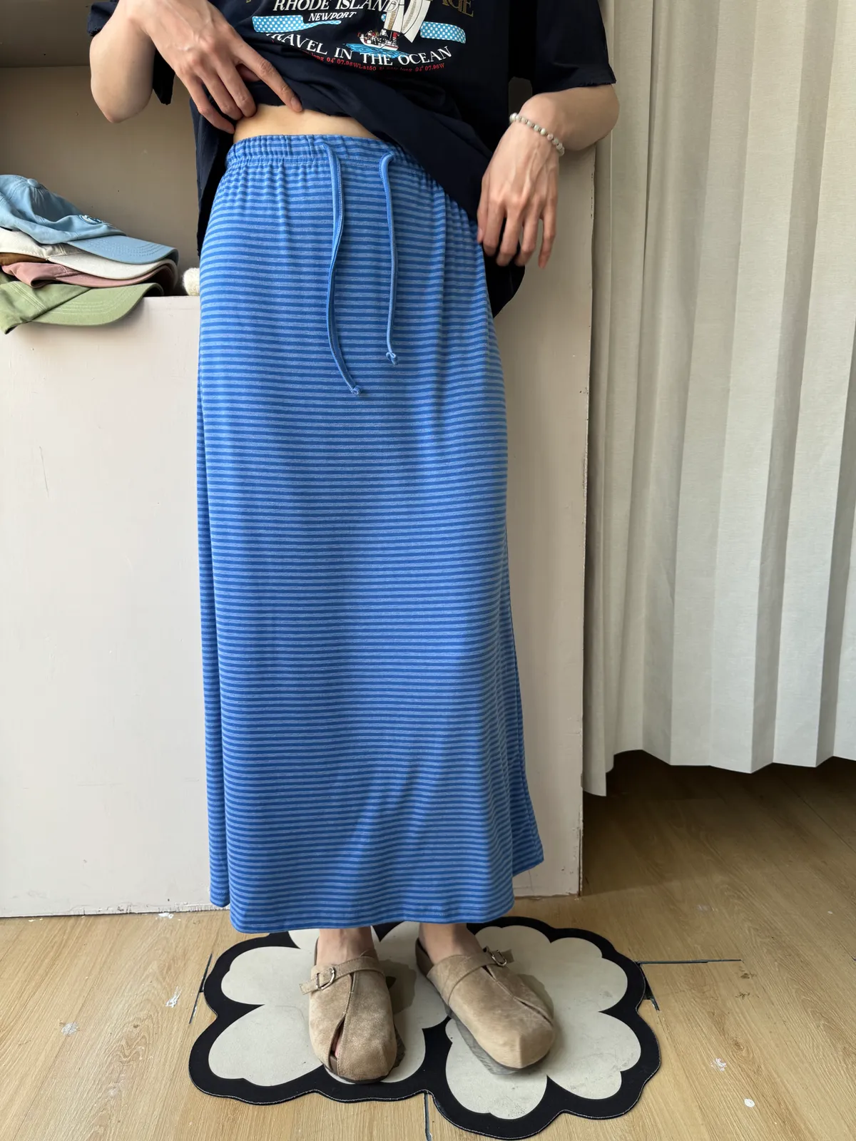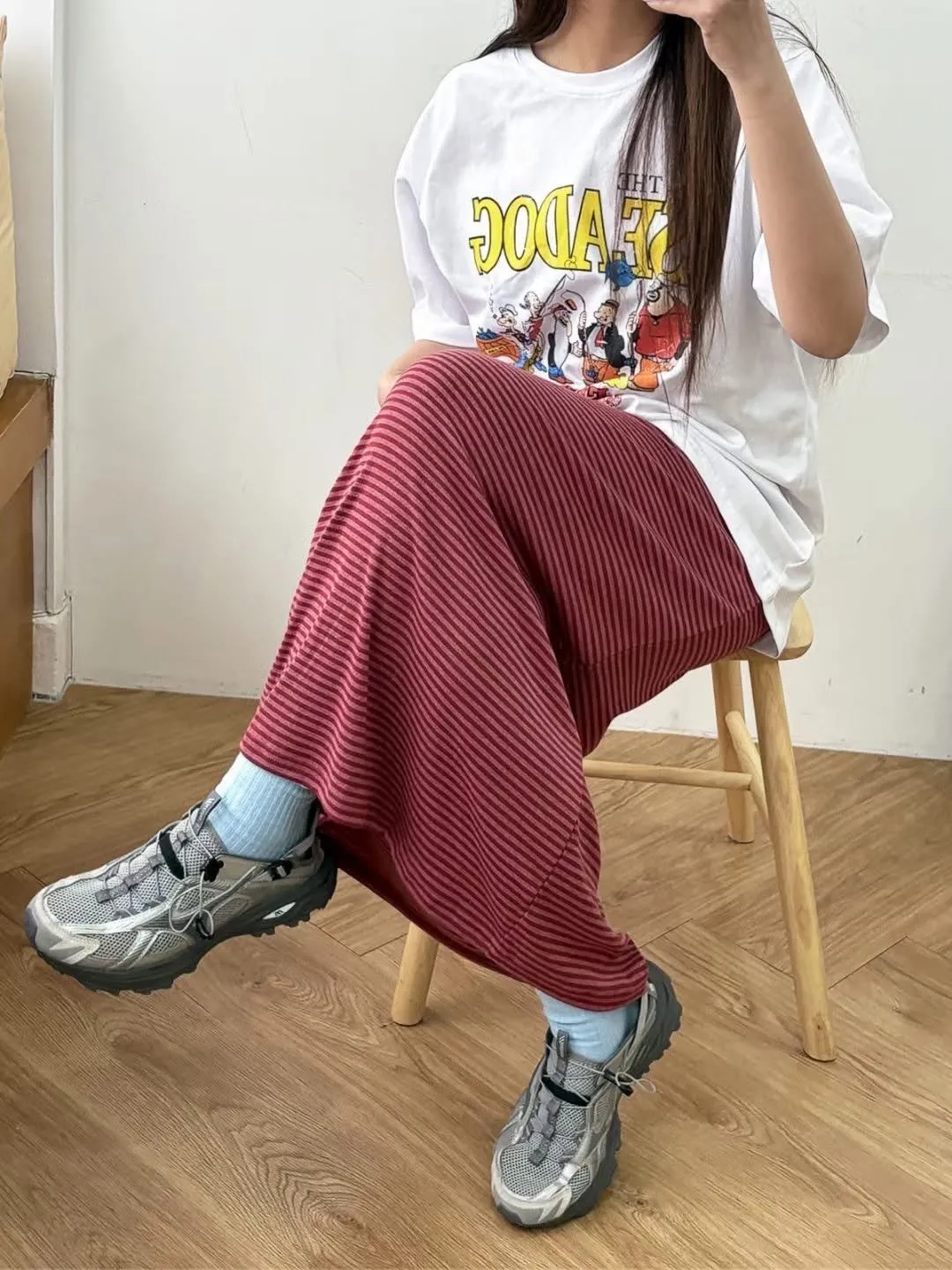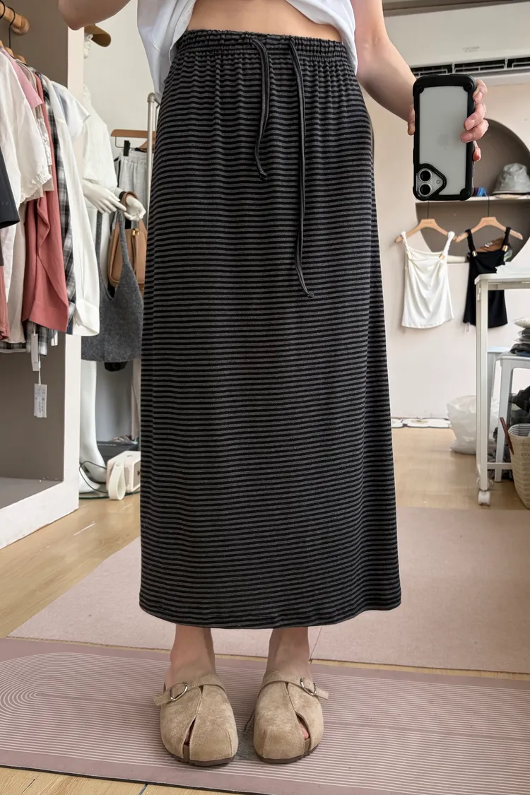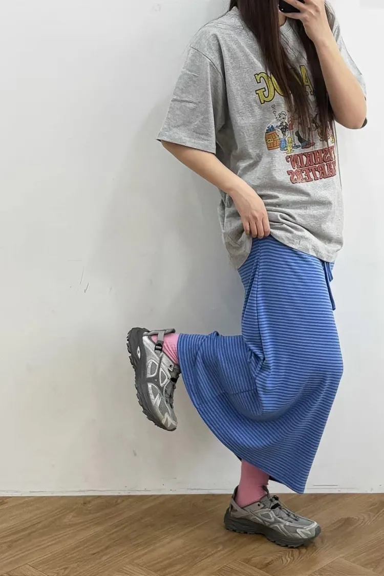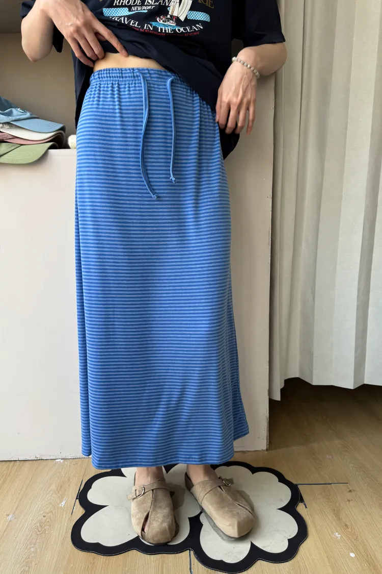 鬆緊腰+細條紋設計讓整體很輕鬆,穿起來有一點日系慵懶味。