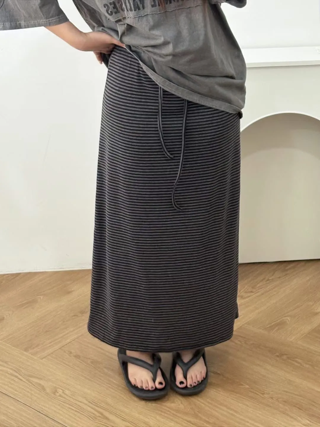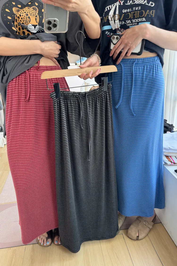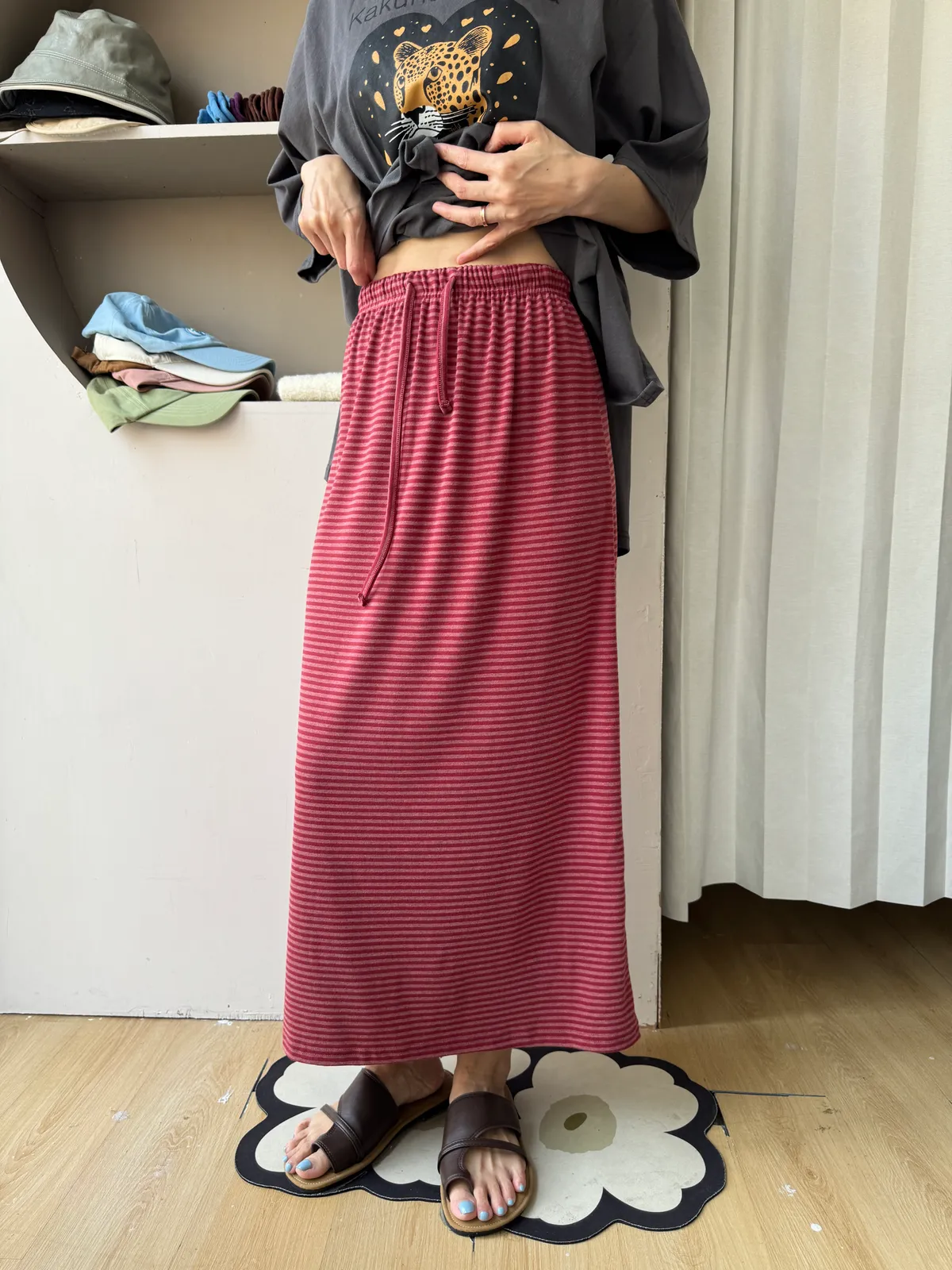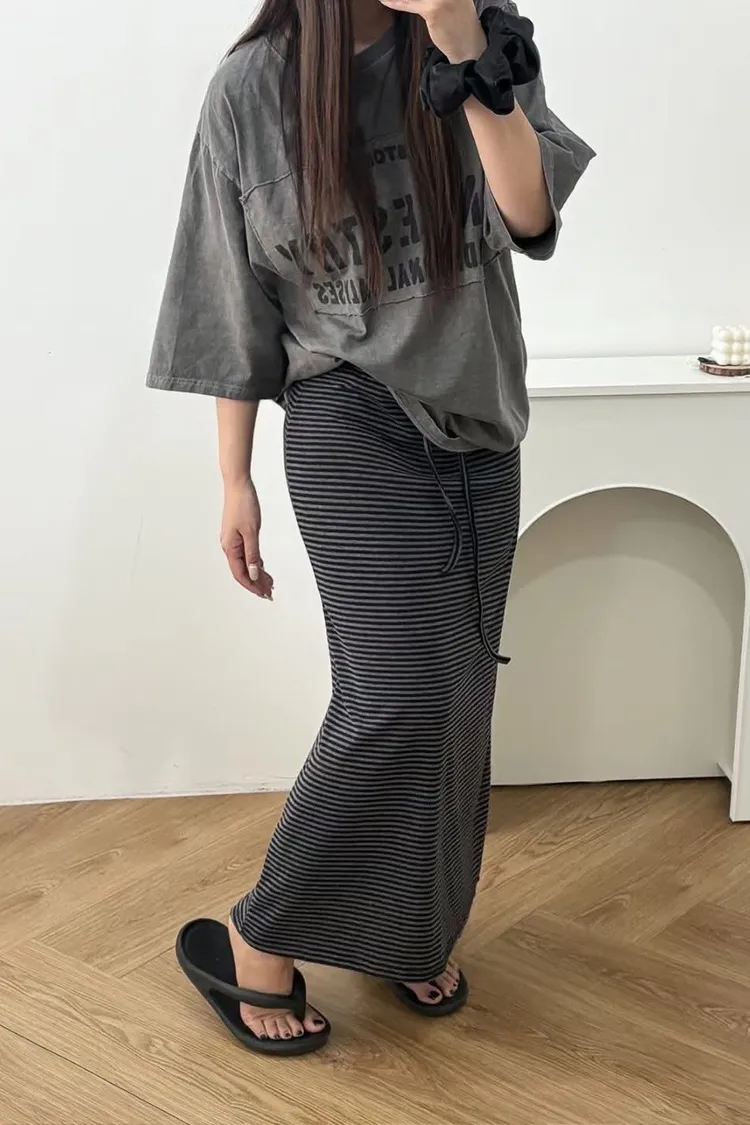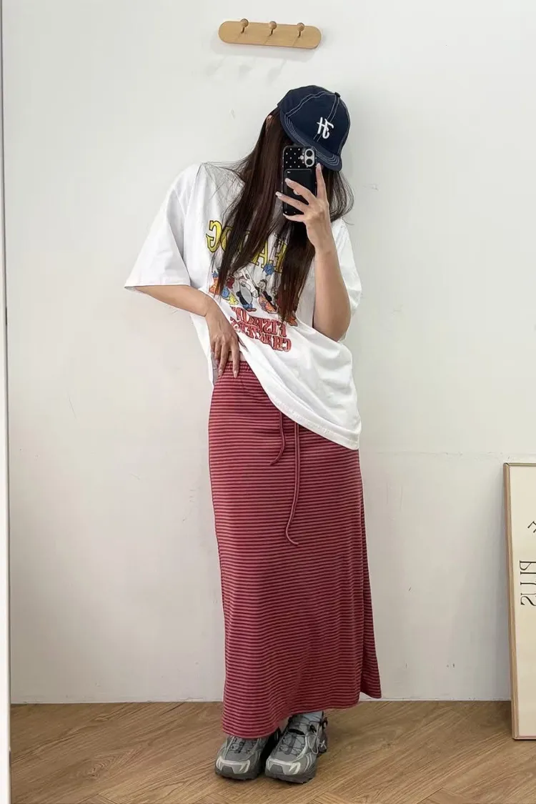 鬆緊腰+細條紋設計讓整體很輕鬆,穿起來有一點日系慵懶味。