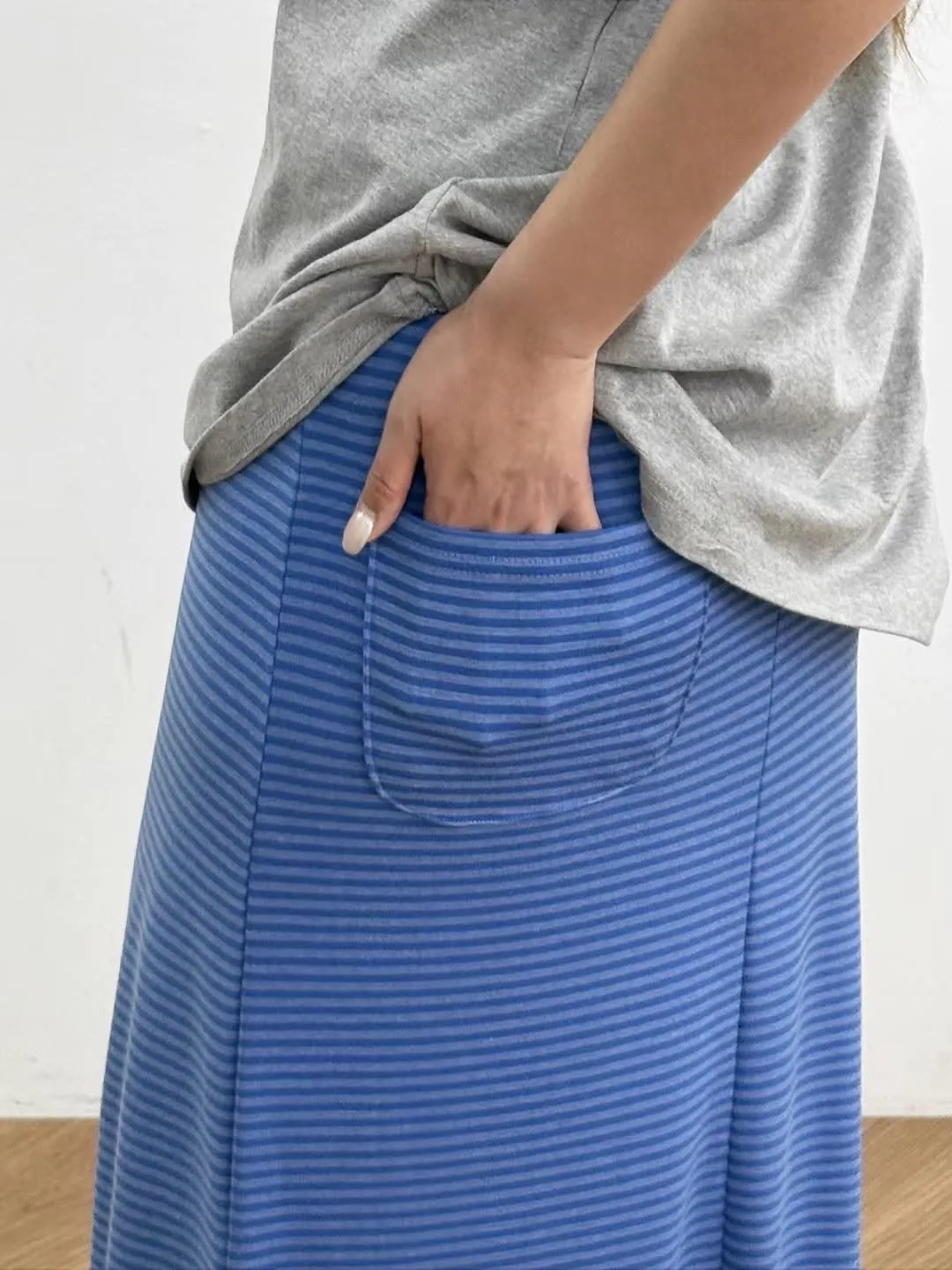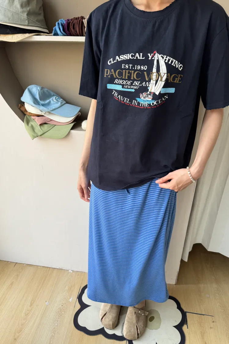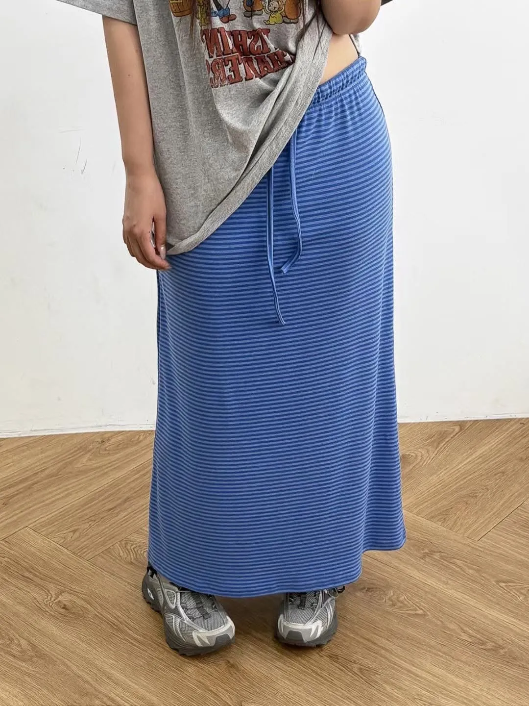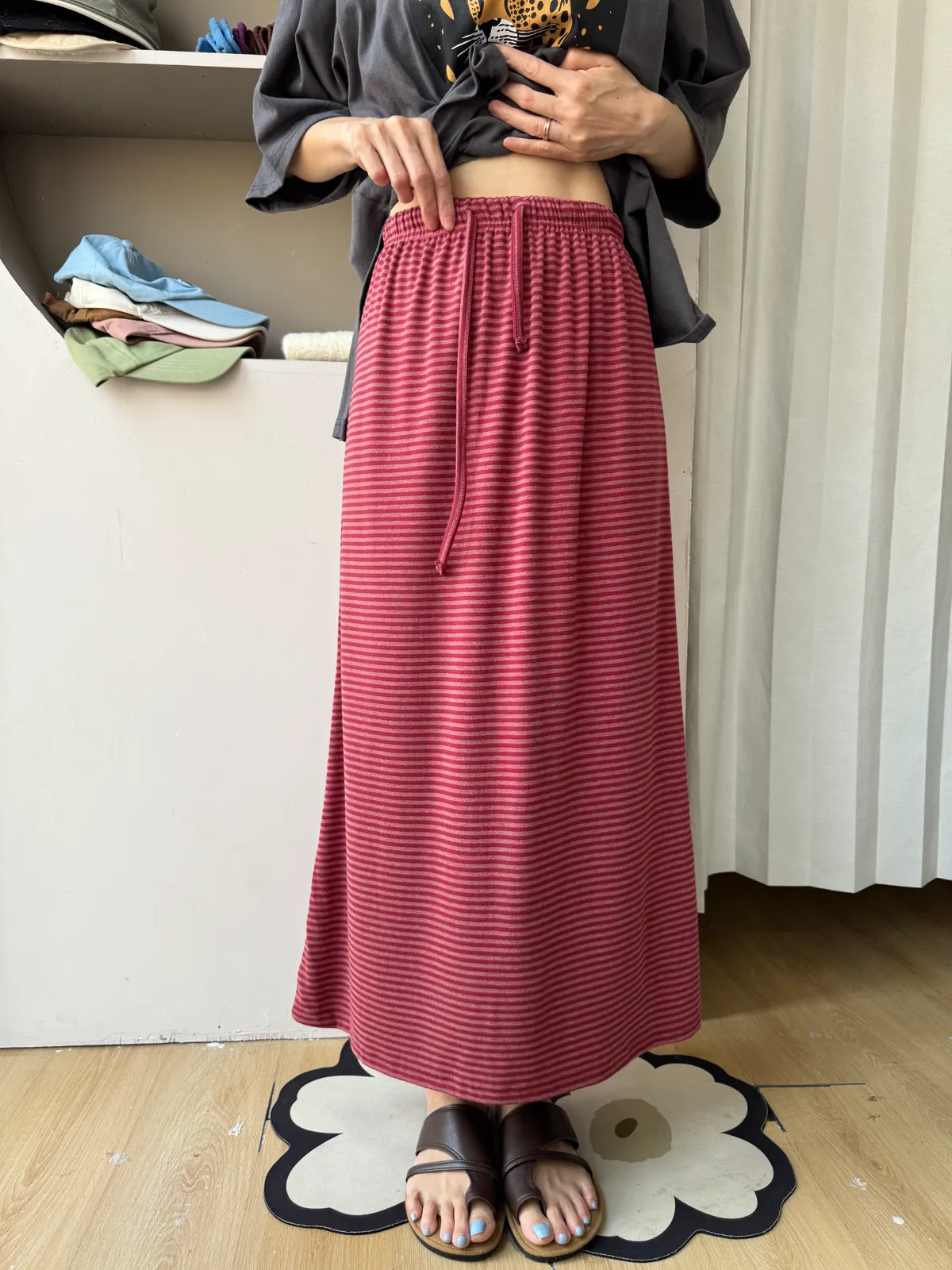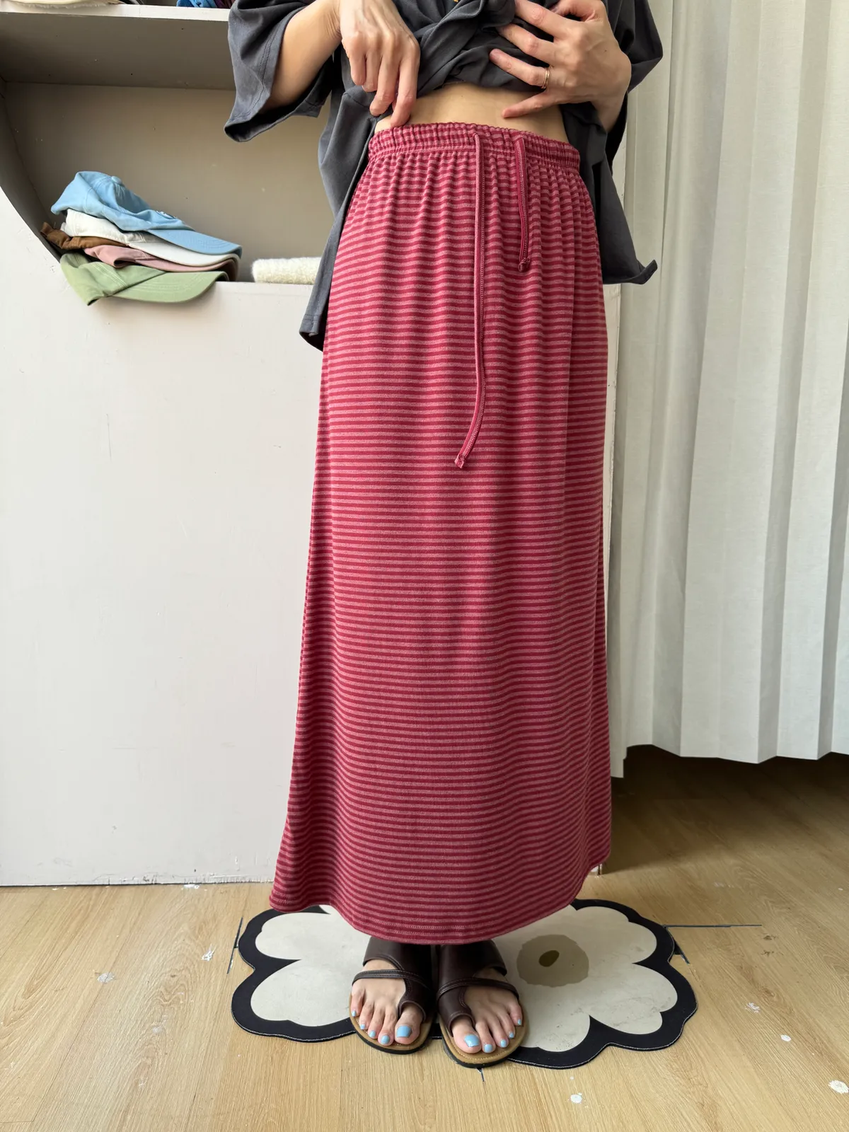 鬆緊腰+細條紋設計讓整體很輕鬆,穿起來有一點日系慵懶味。
