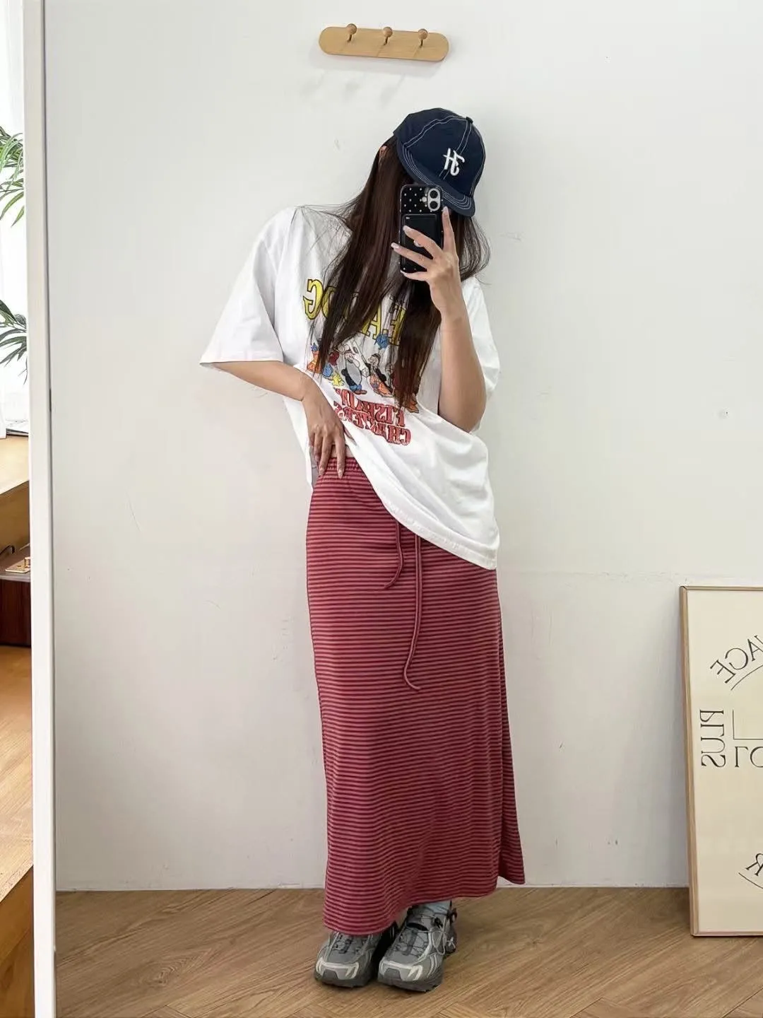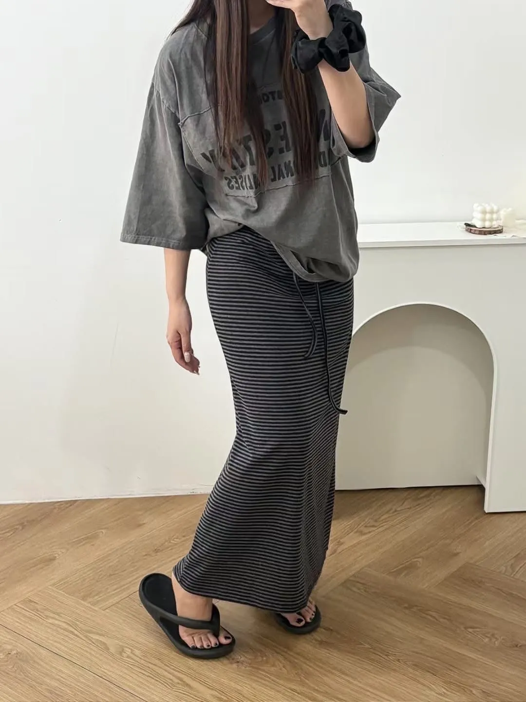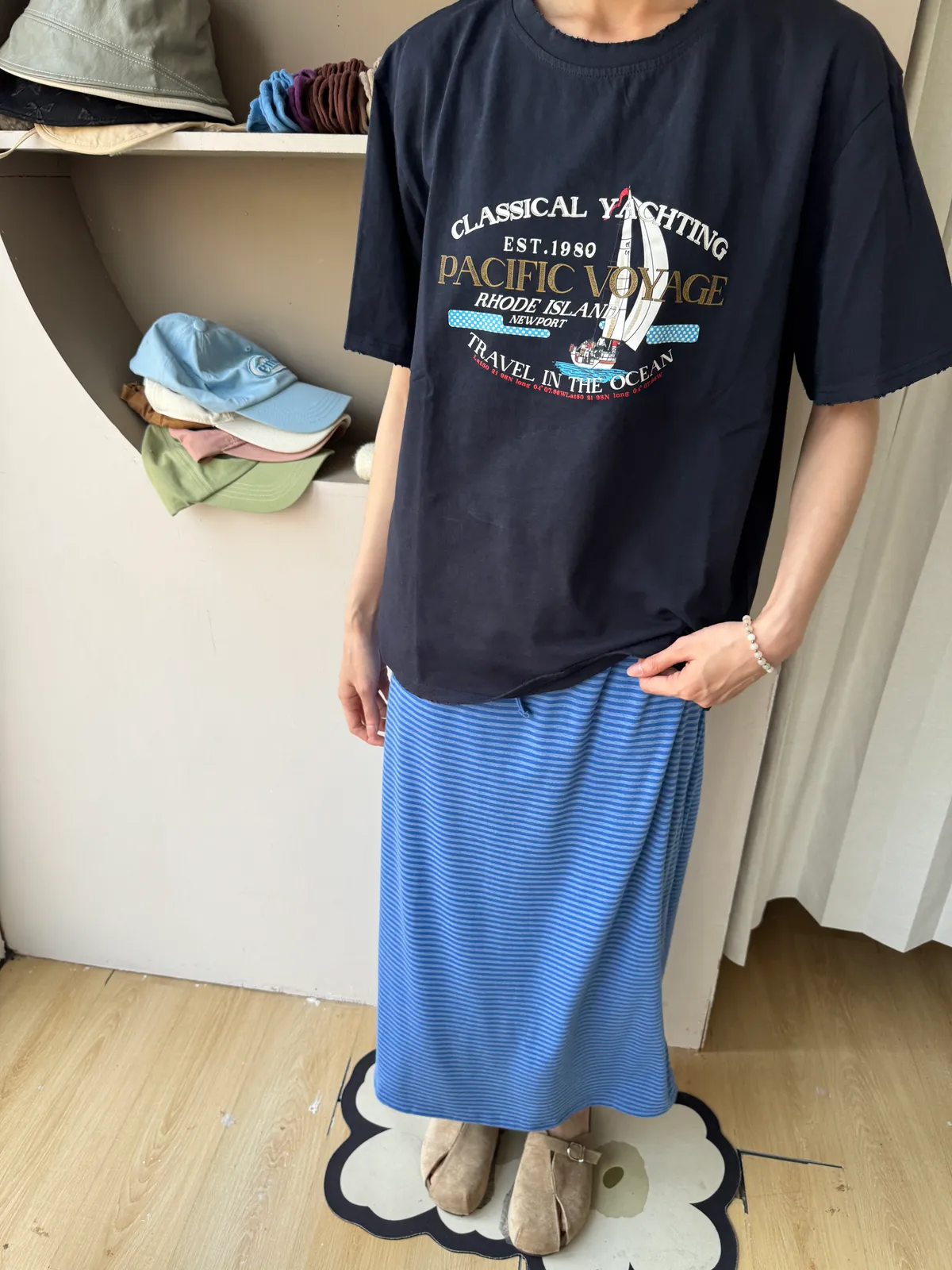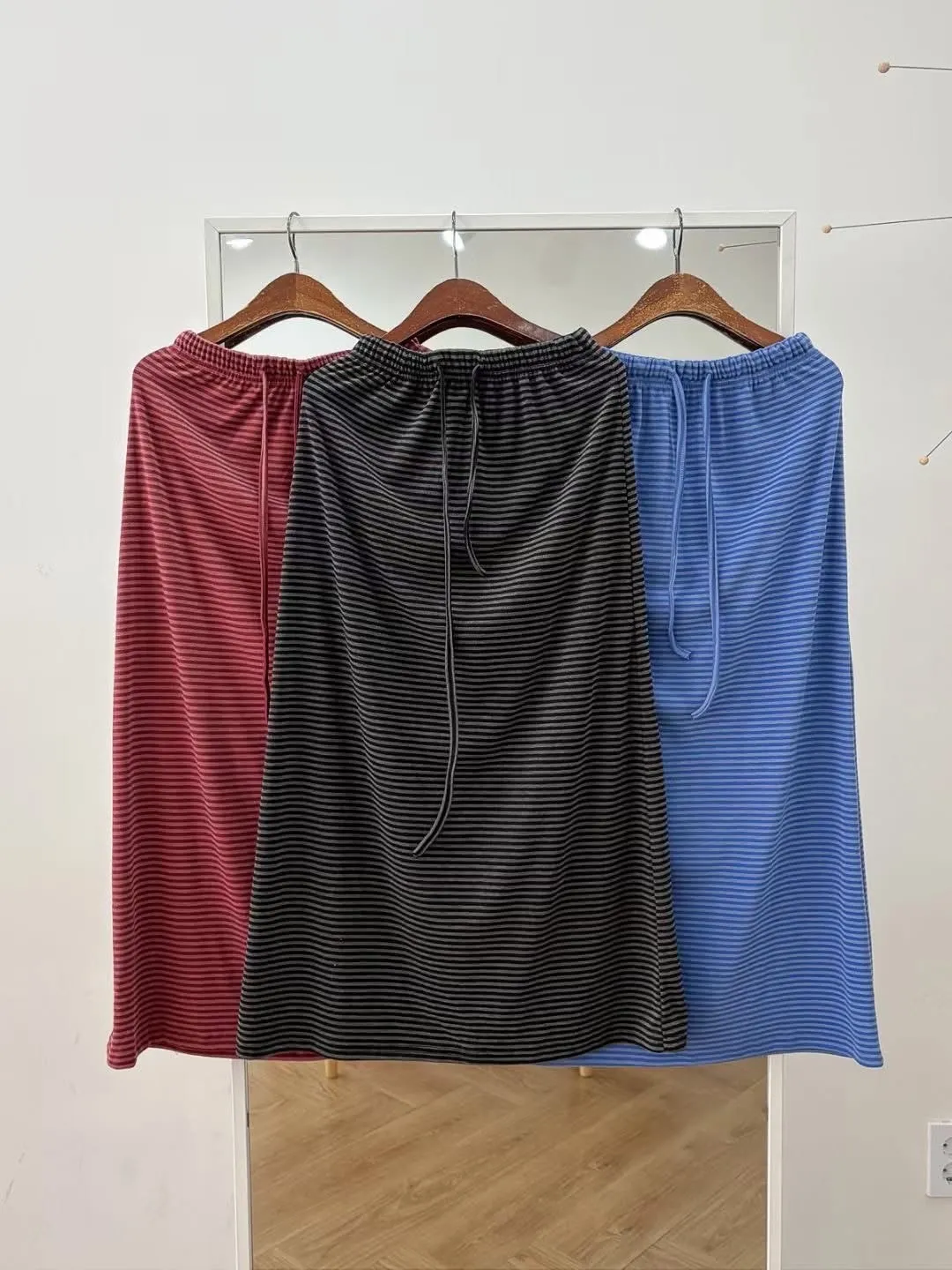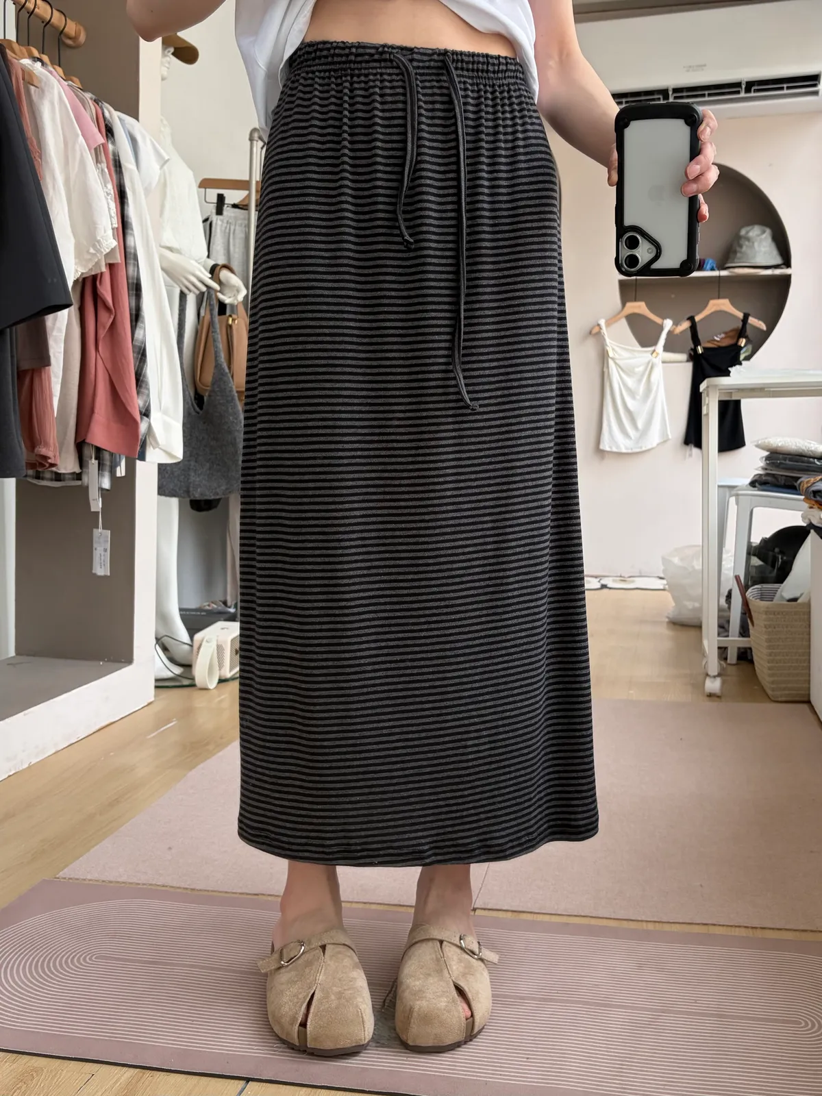 鬆緊腰+細條紋設計讓整體很輕鬆,穿起來有一點日系慵懶味。