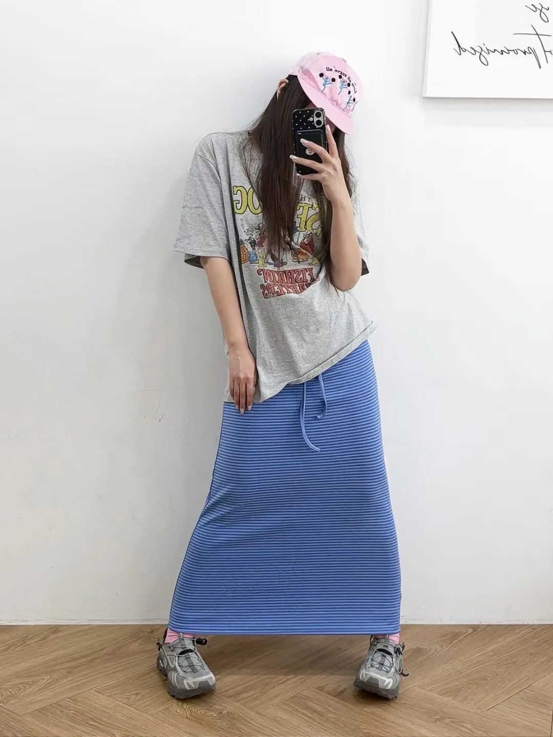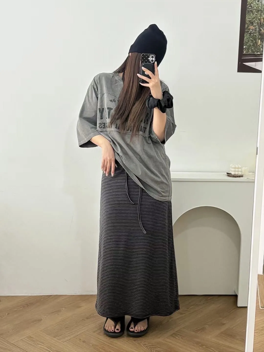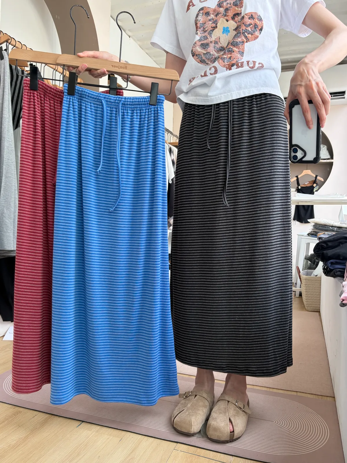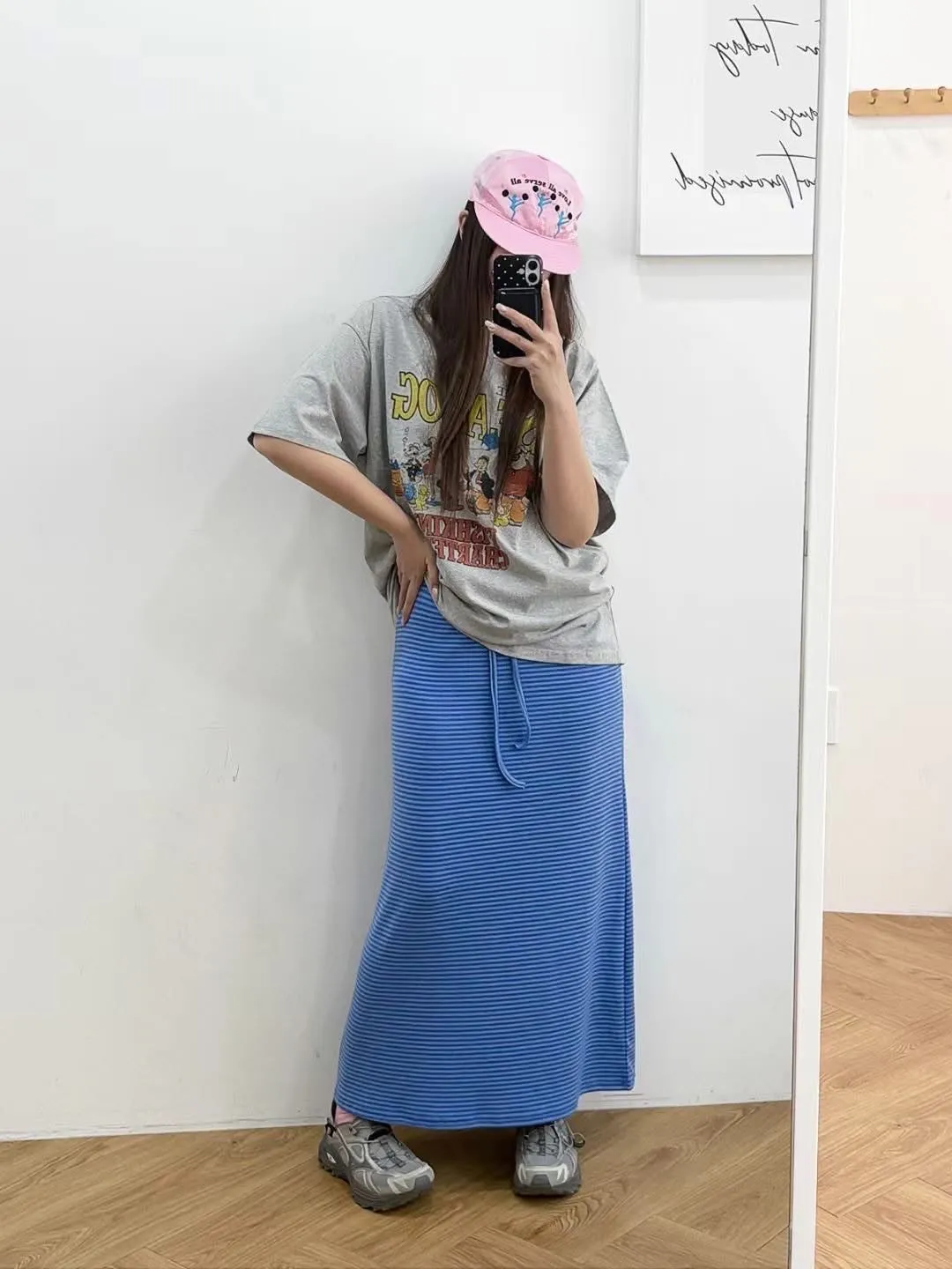 鬆緊腰+細條紋設計讓整體很輕鬆,穿起來有一點日系慵懶味。