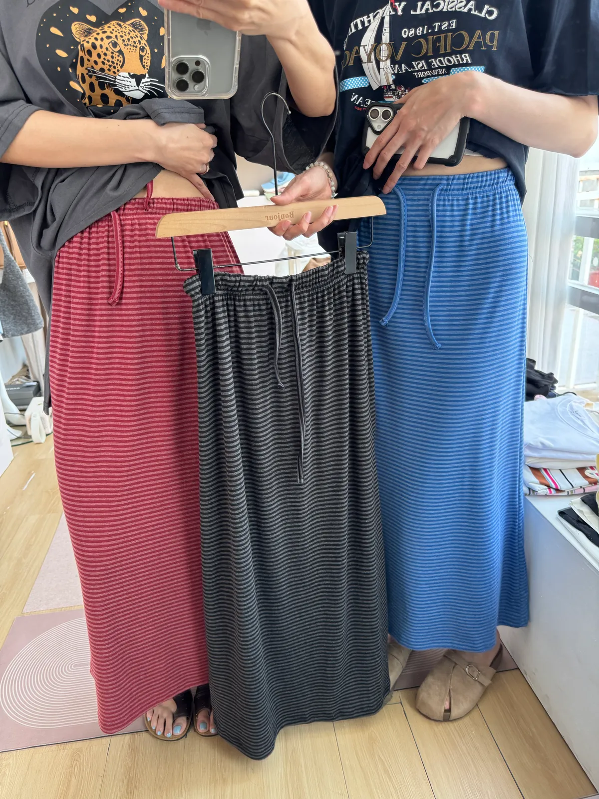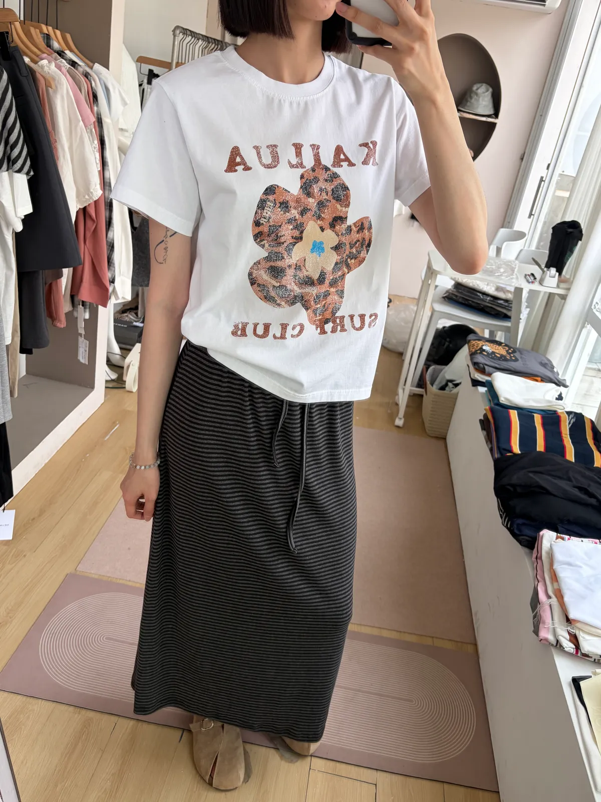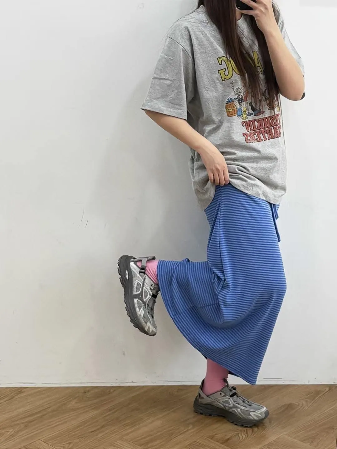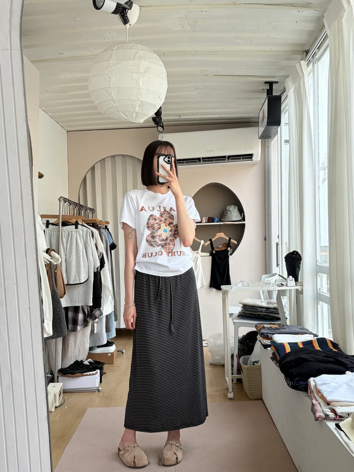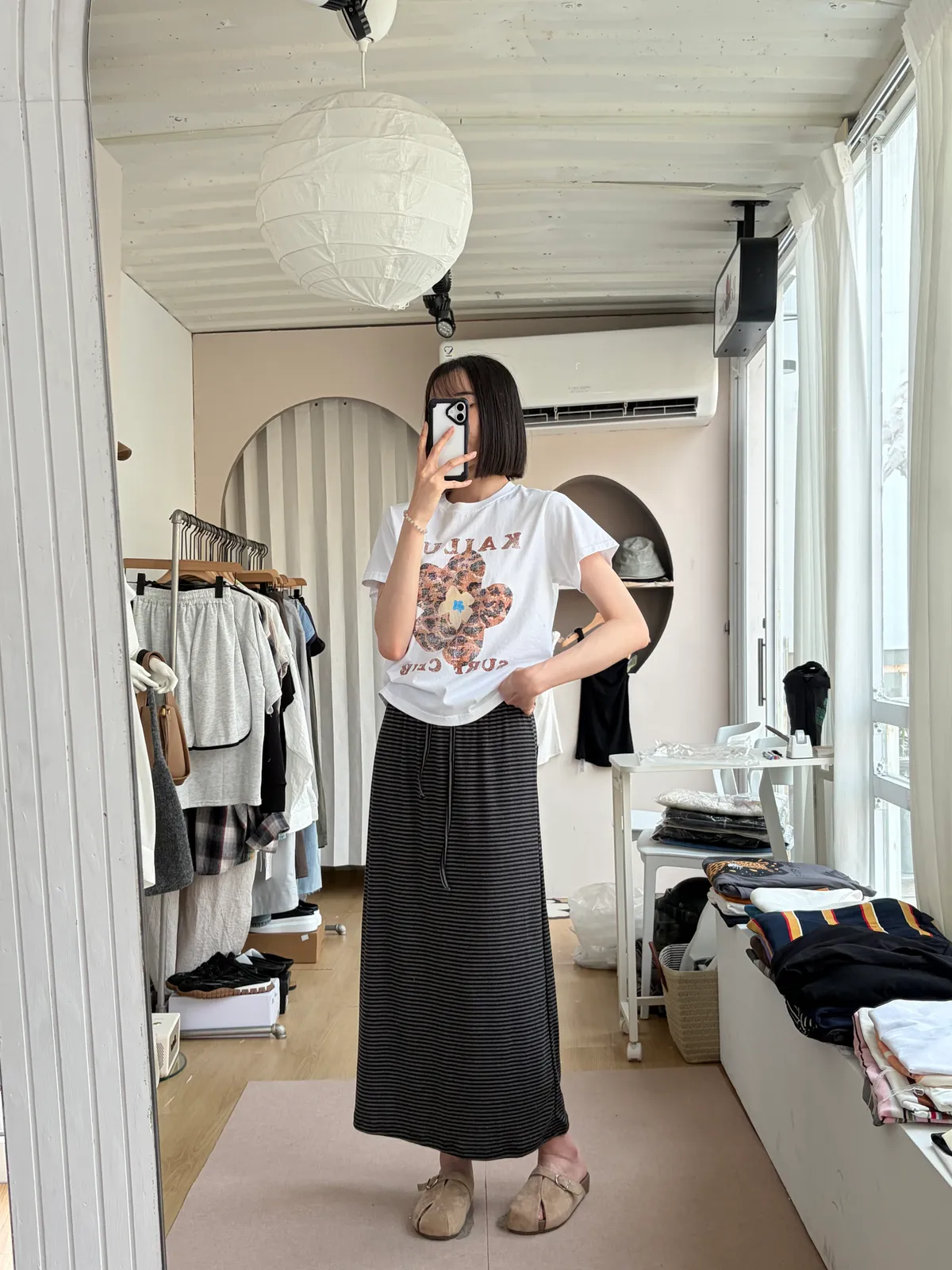 鬆緊腰+細條紋設計讓整體很輕鬆,穿起來有一點日系慵懶味。