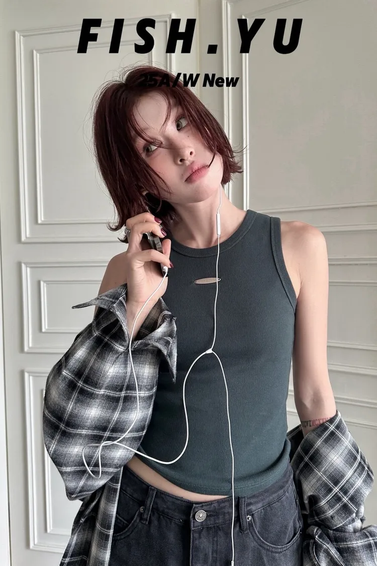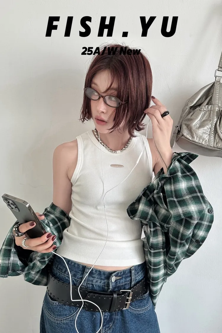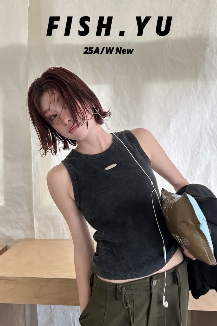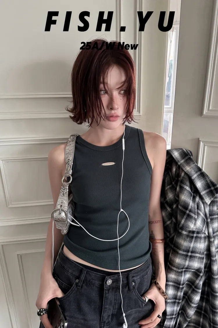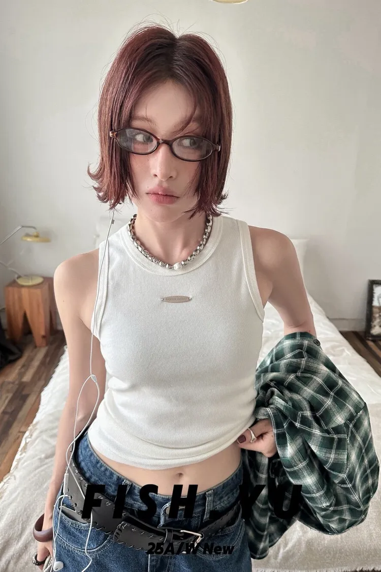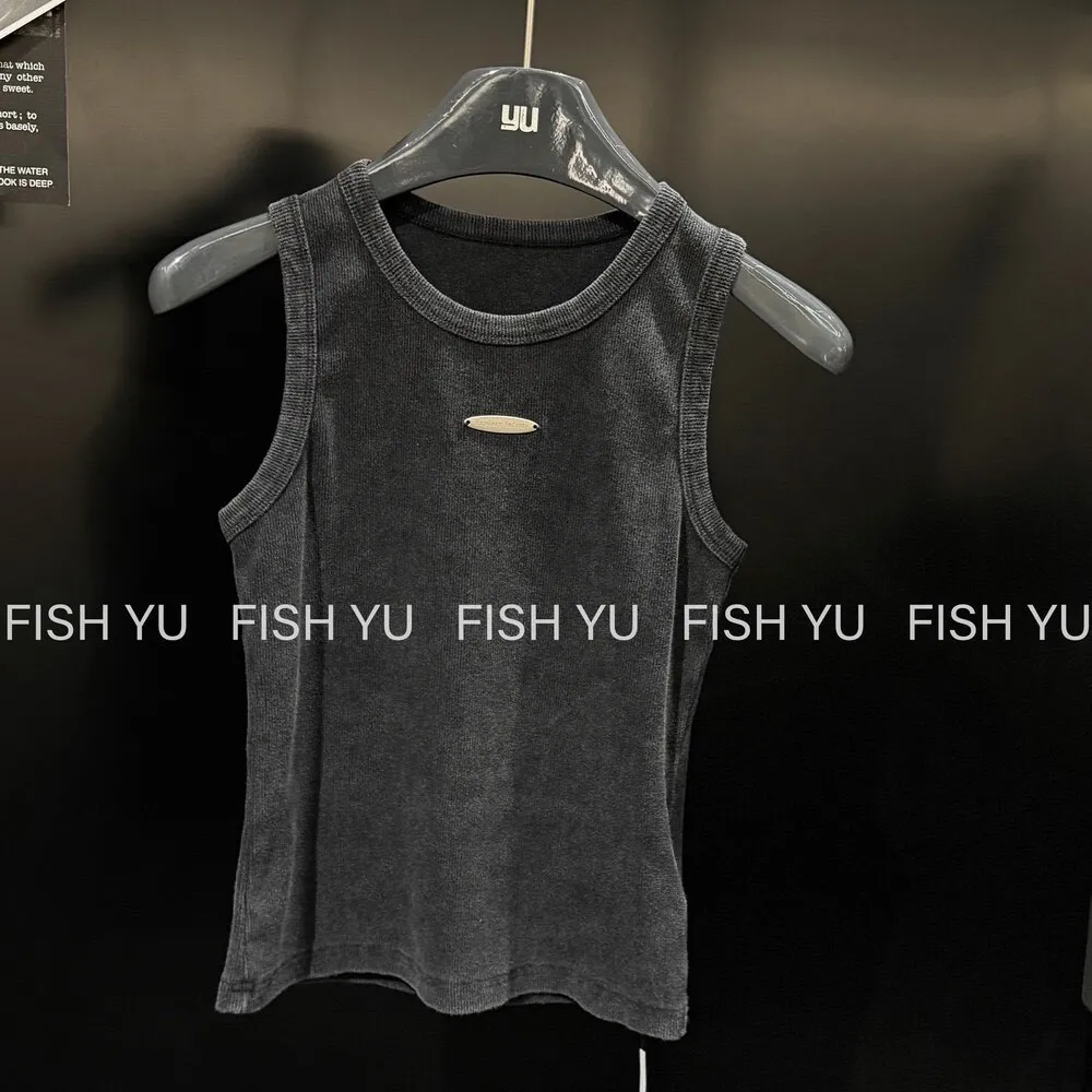 美式字母小貼標水洗炒色彈力緊身背心