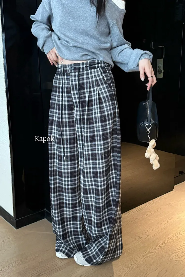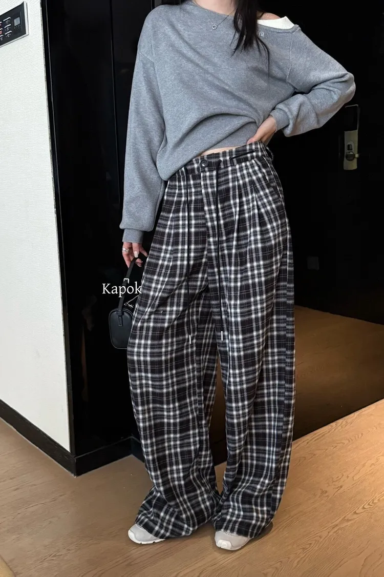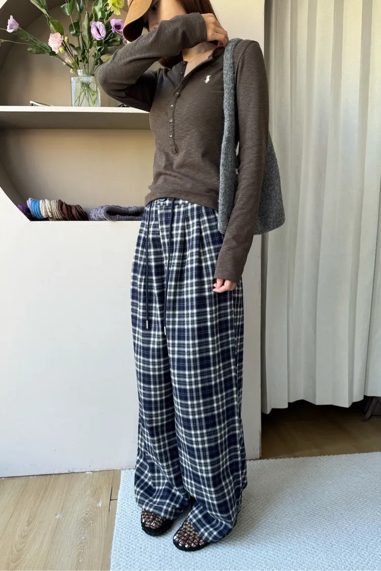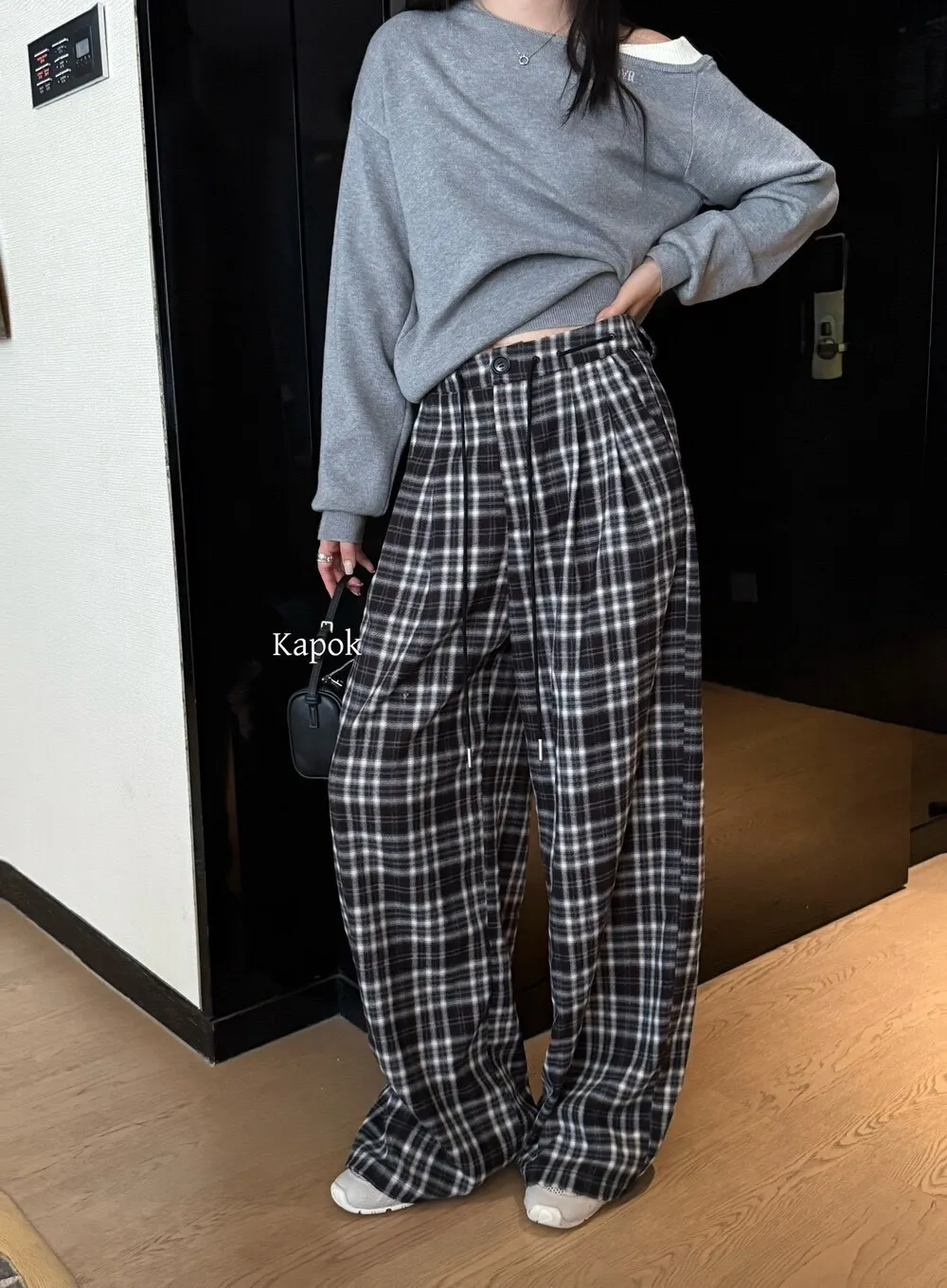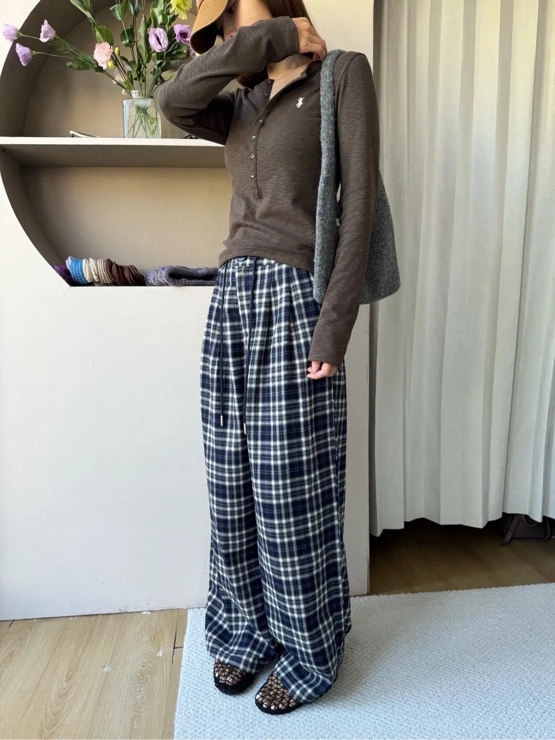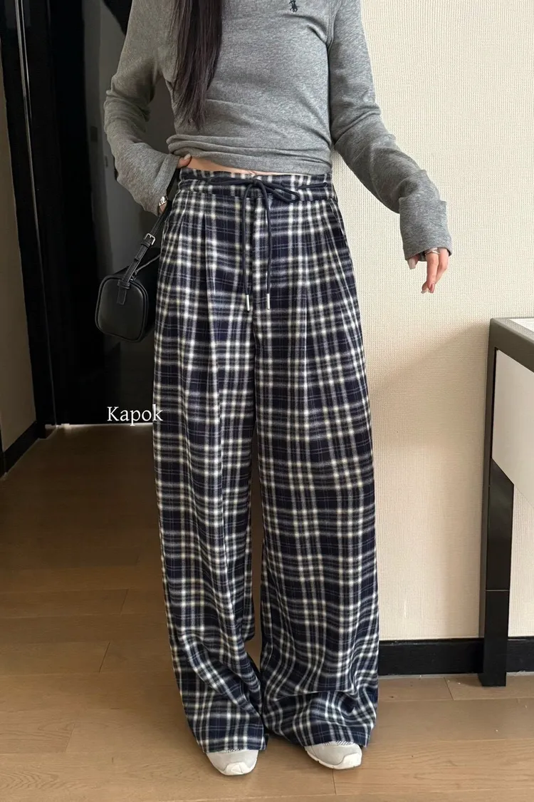 磨毛腰頭抽繩百搭格子休閒長褲休閒褲