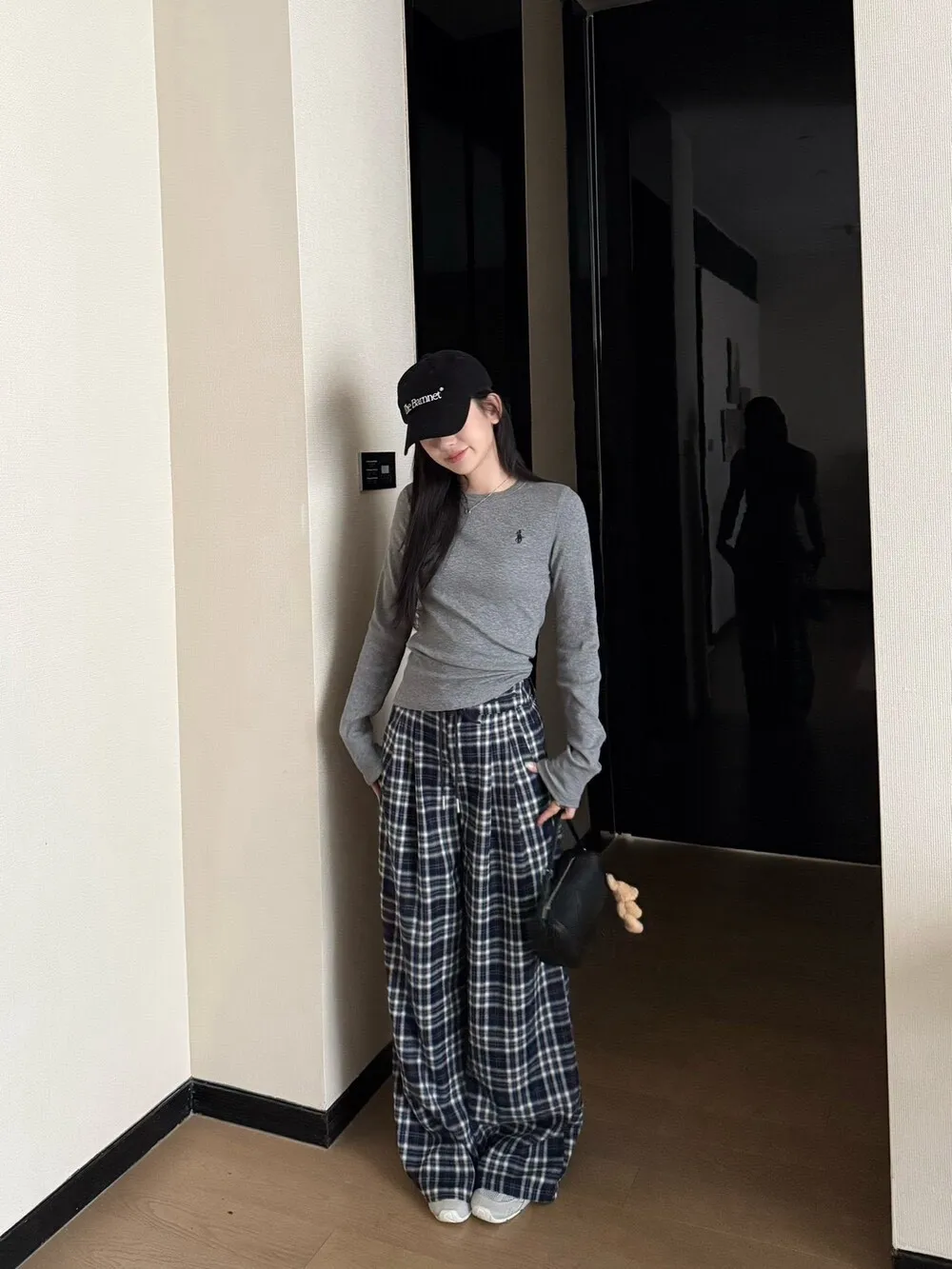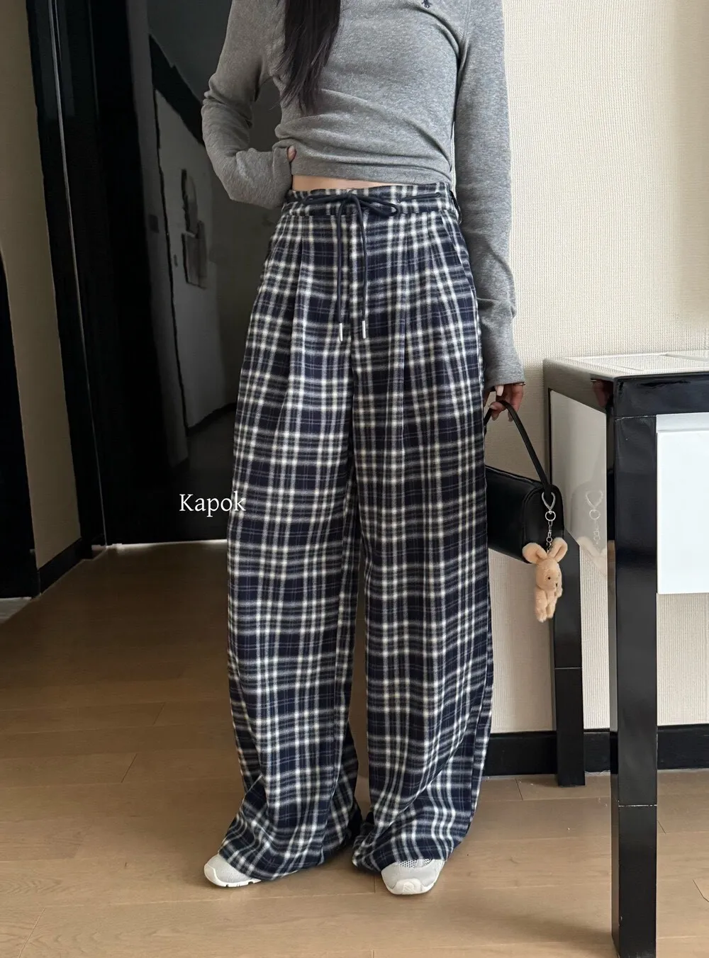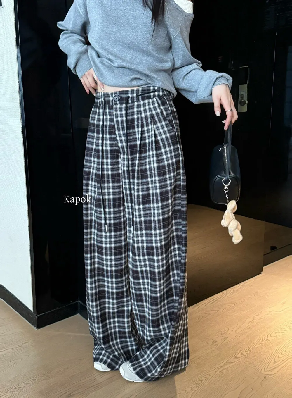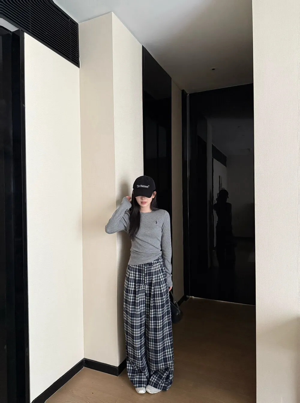 磨毛腰頭抽繩百搭格子休閒長褲休閒褲
