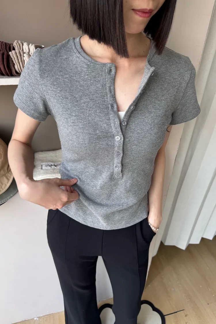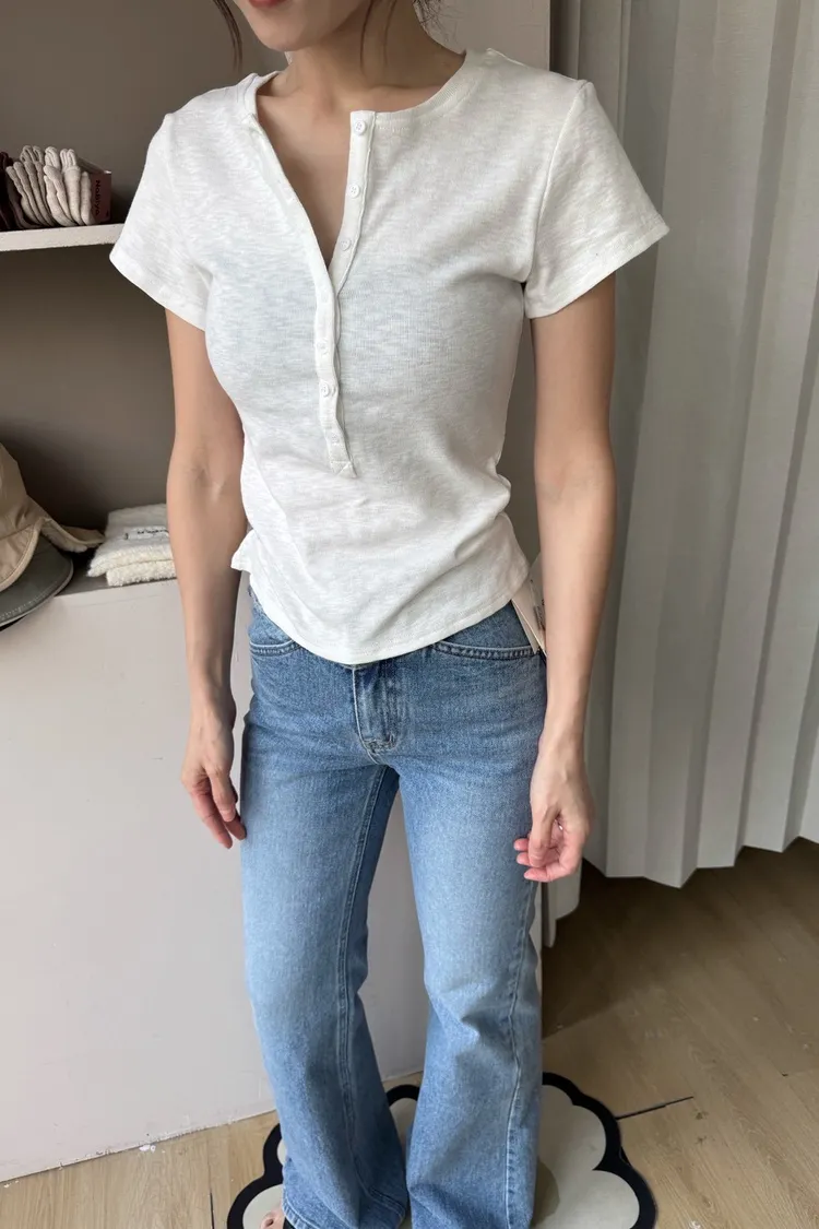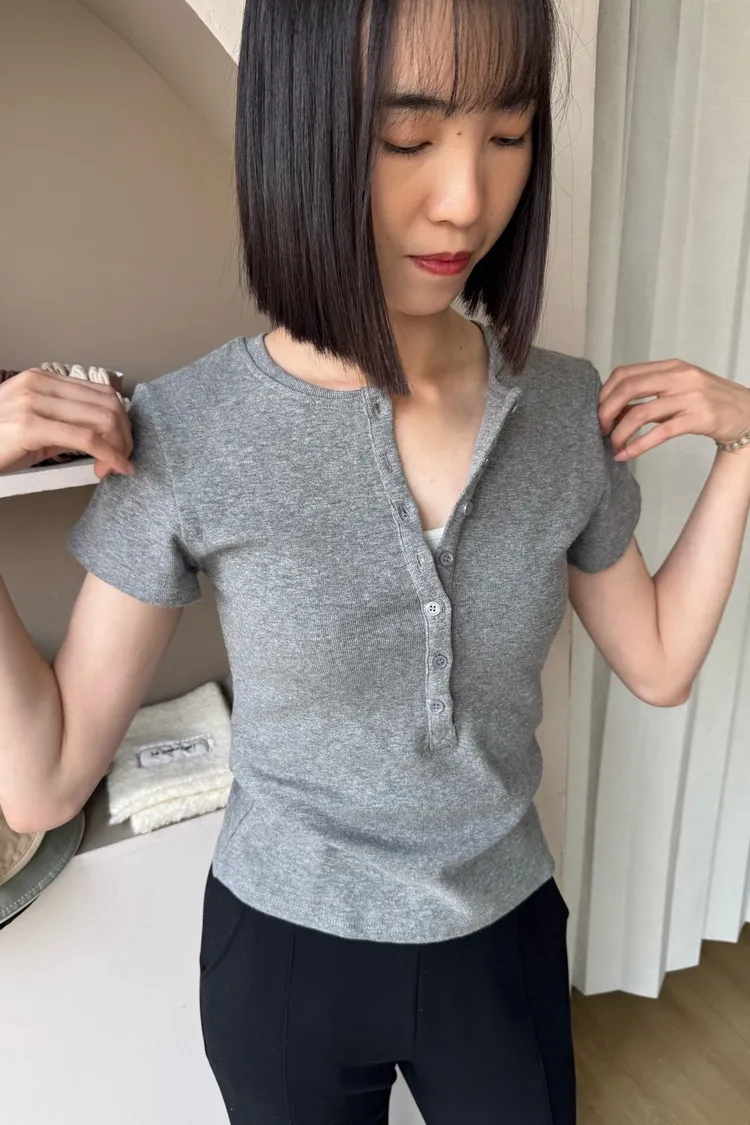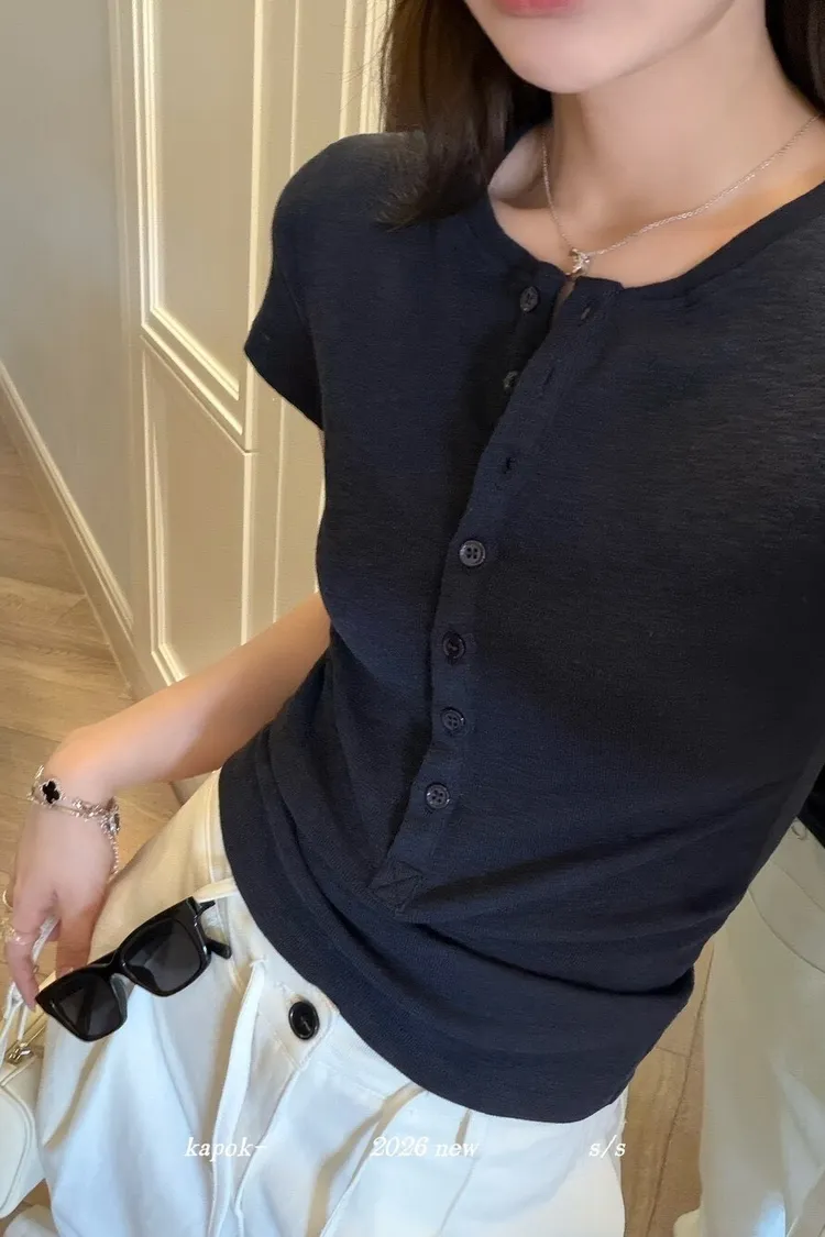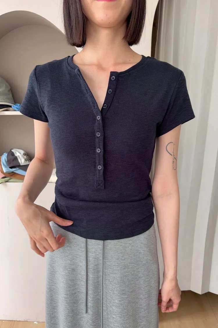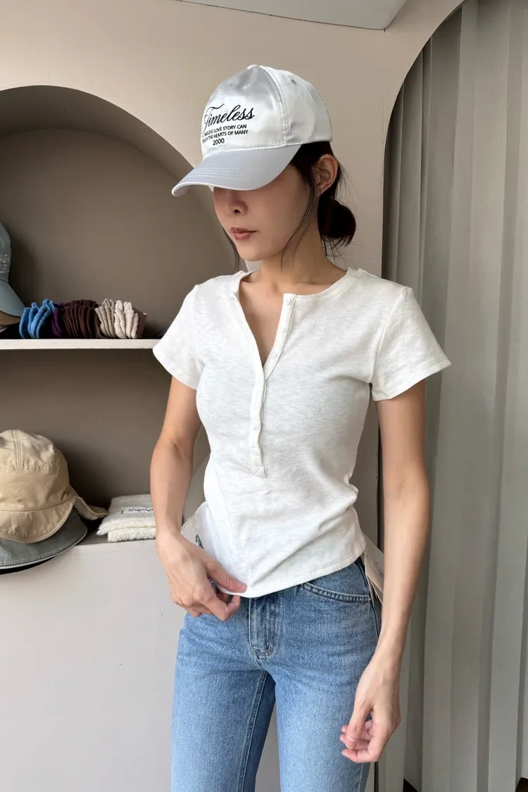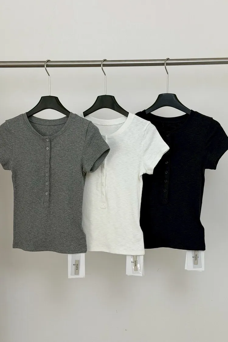 韓系正肩百搭修身半開扣短袖T恤