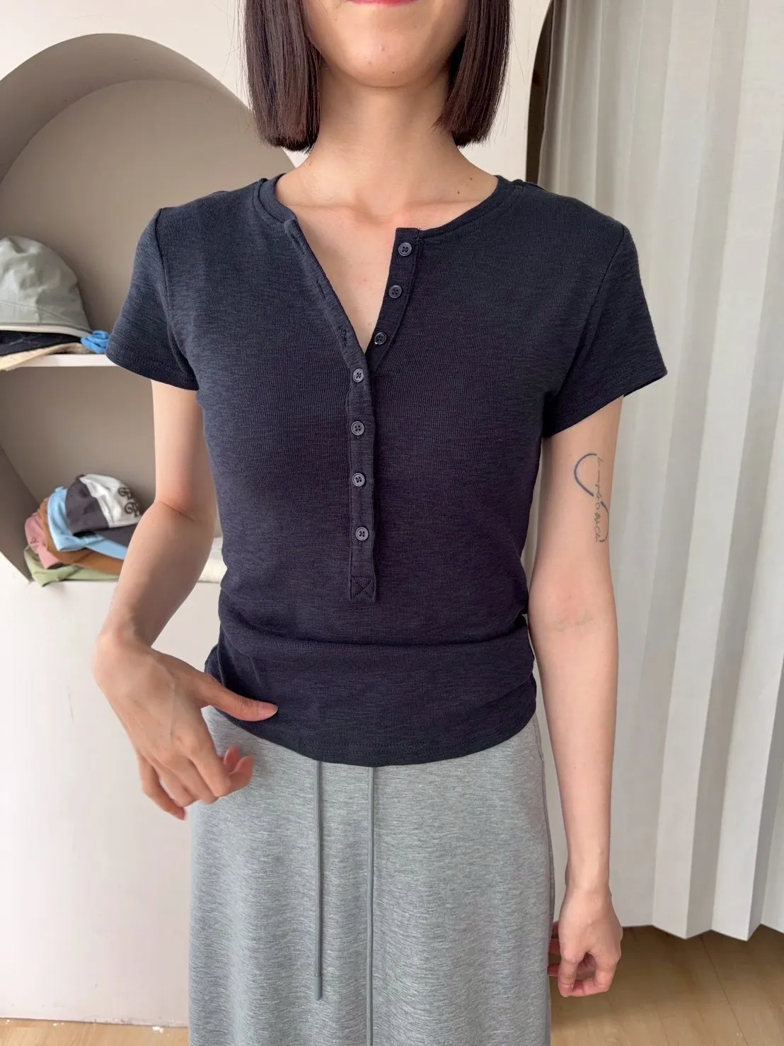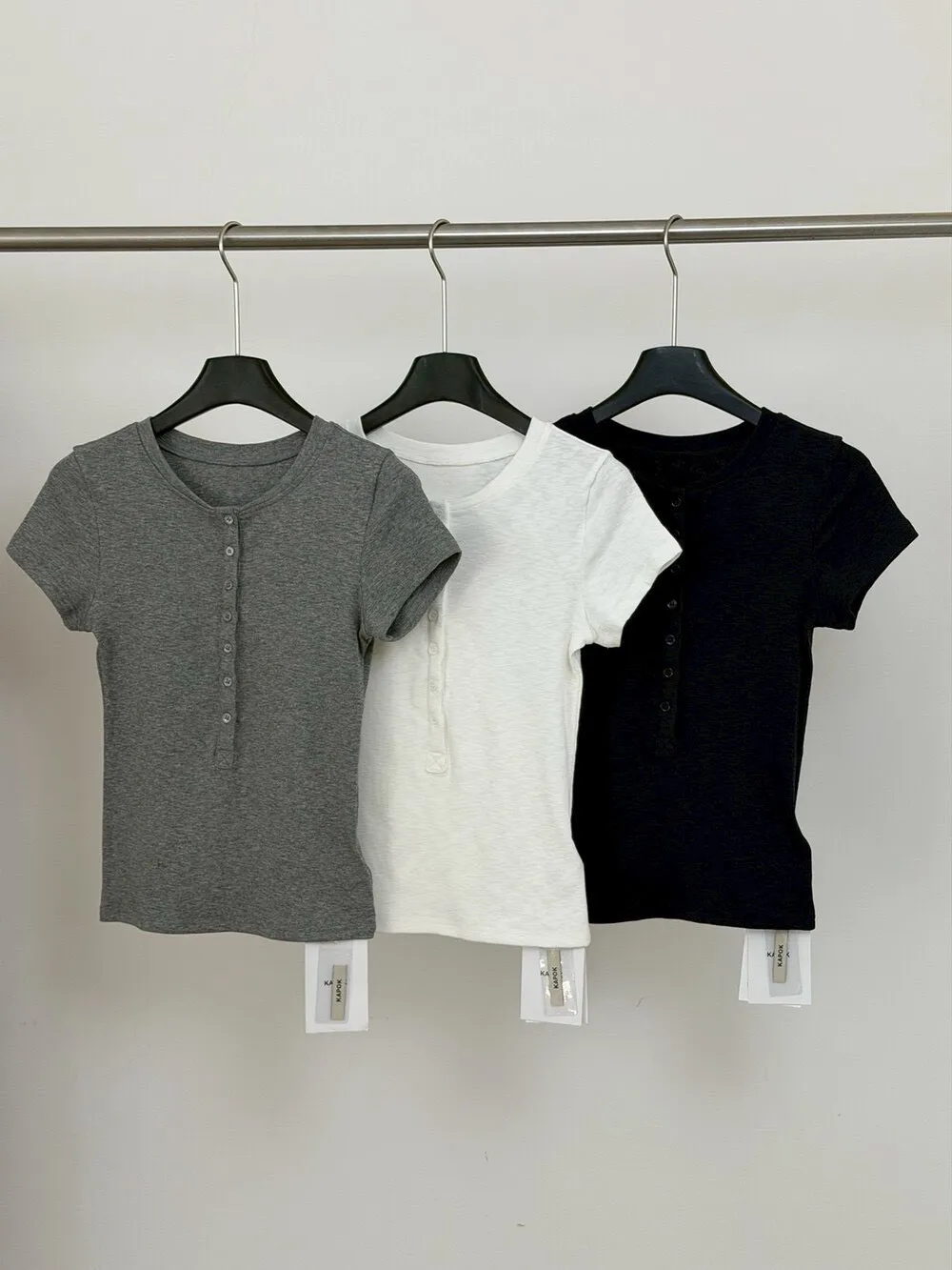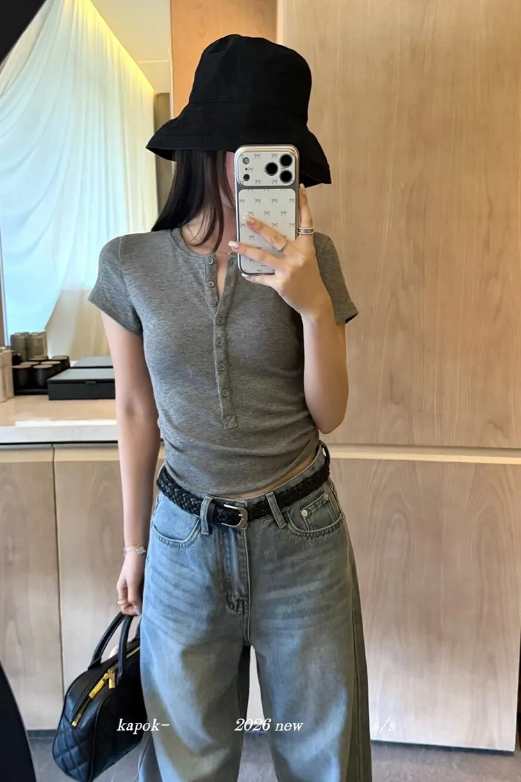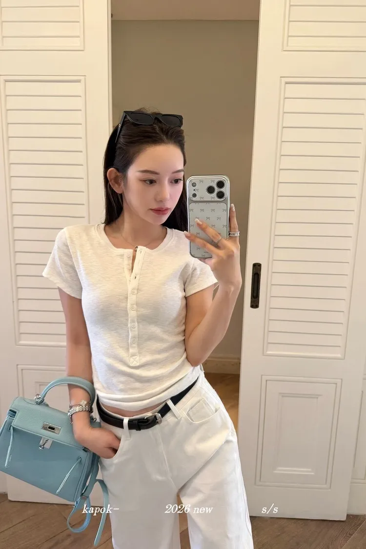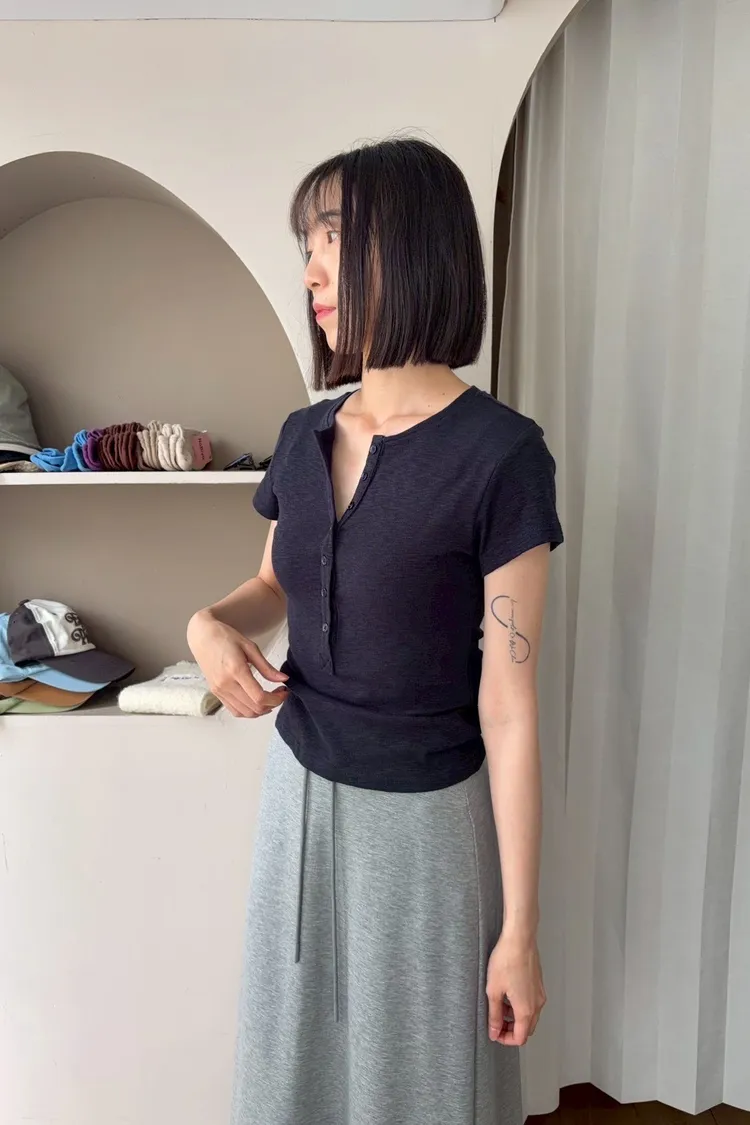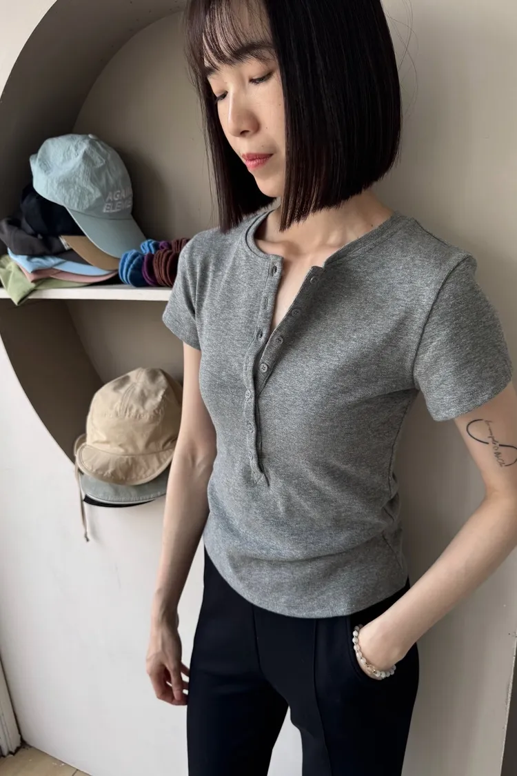 韓系正肩百搭修身半開扣短袖T恤