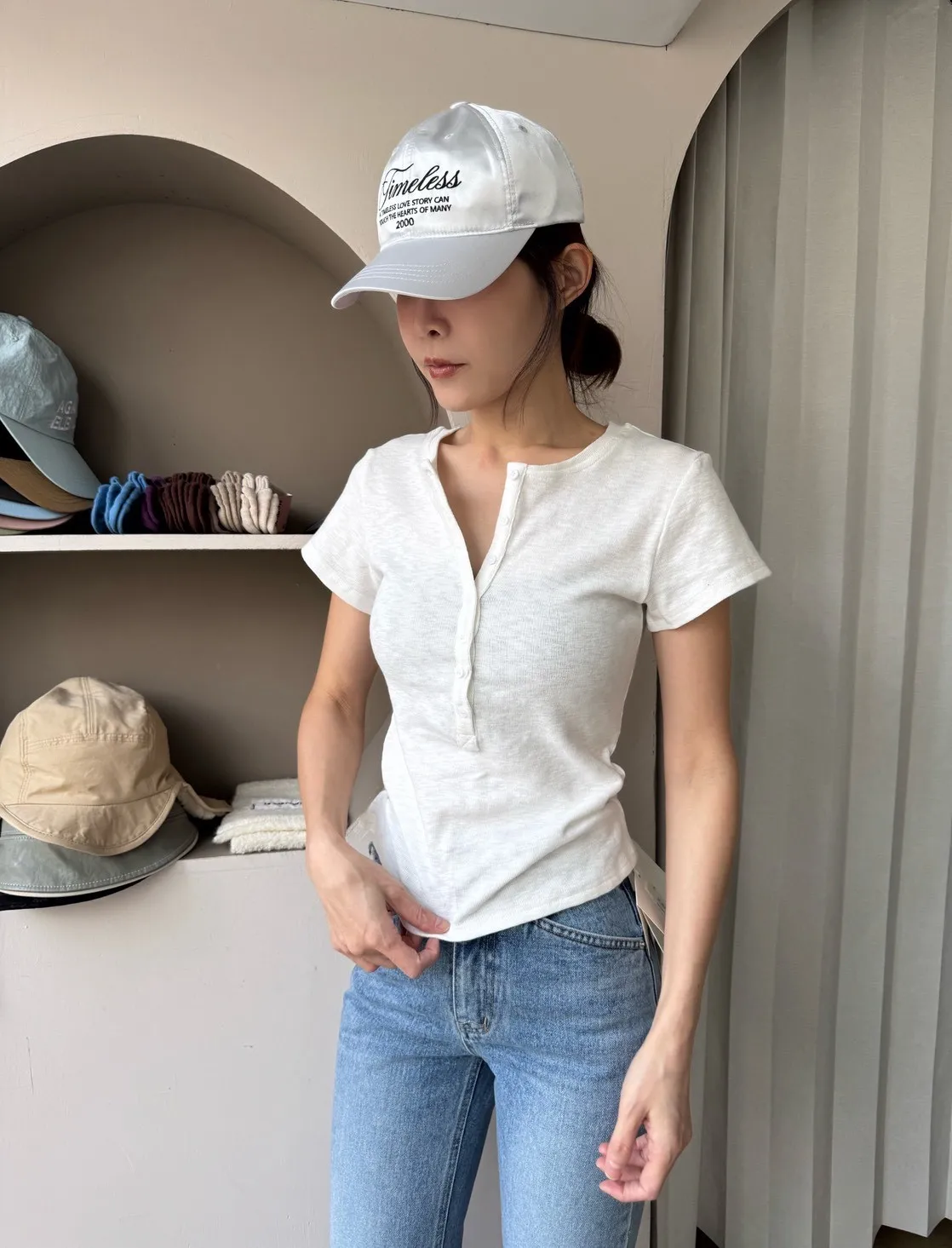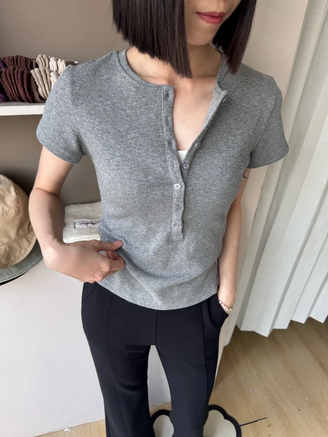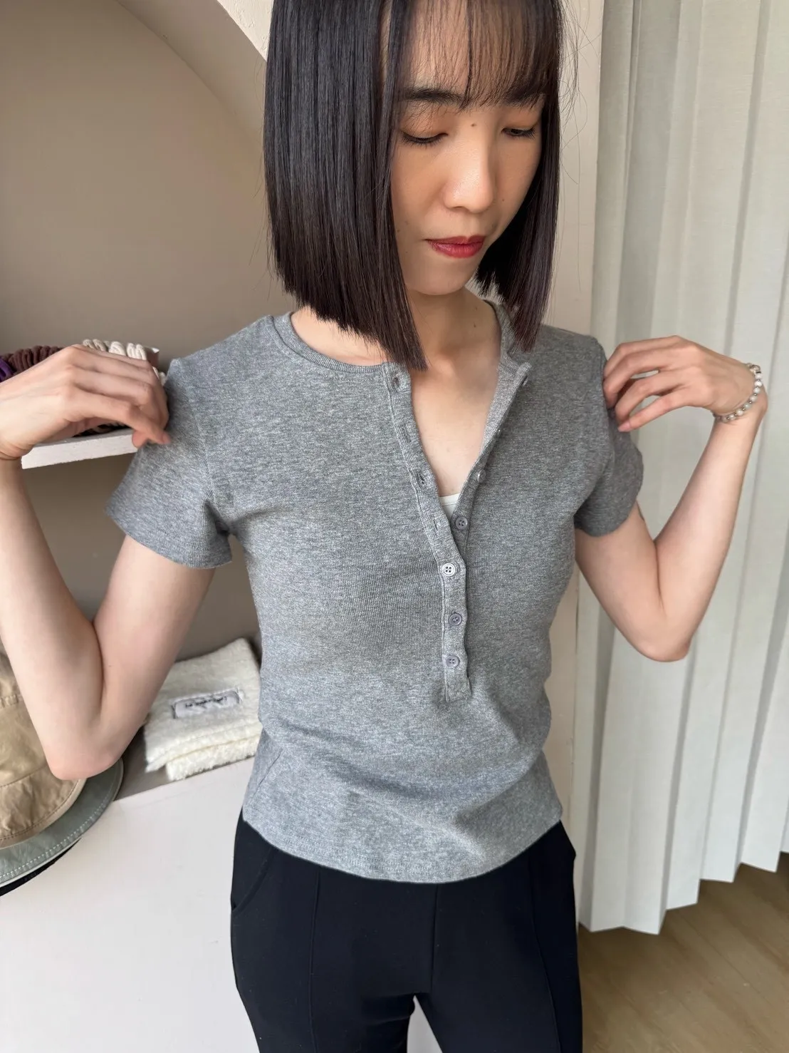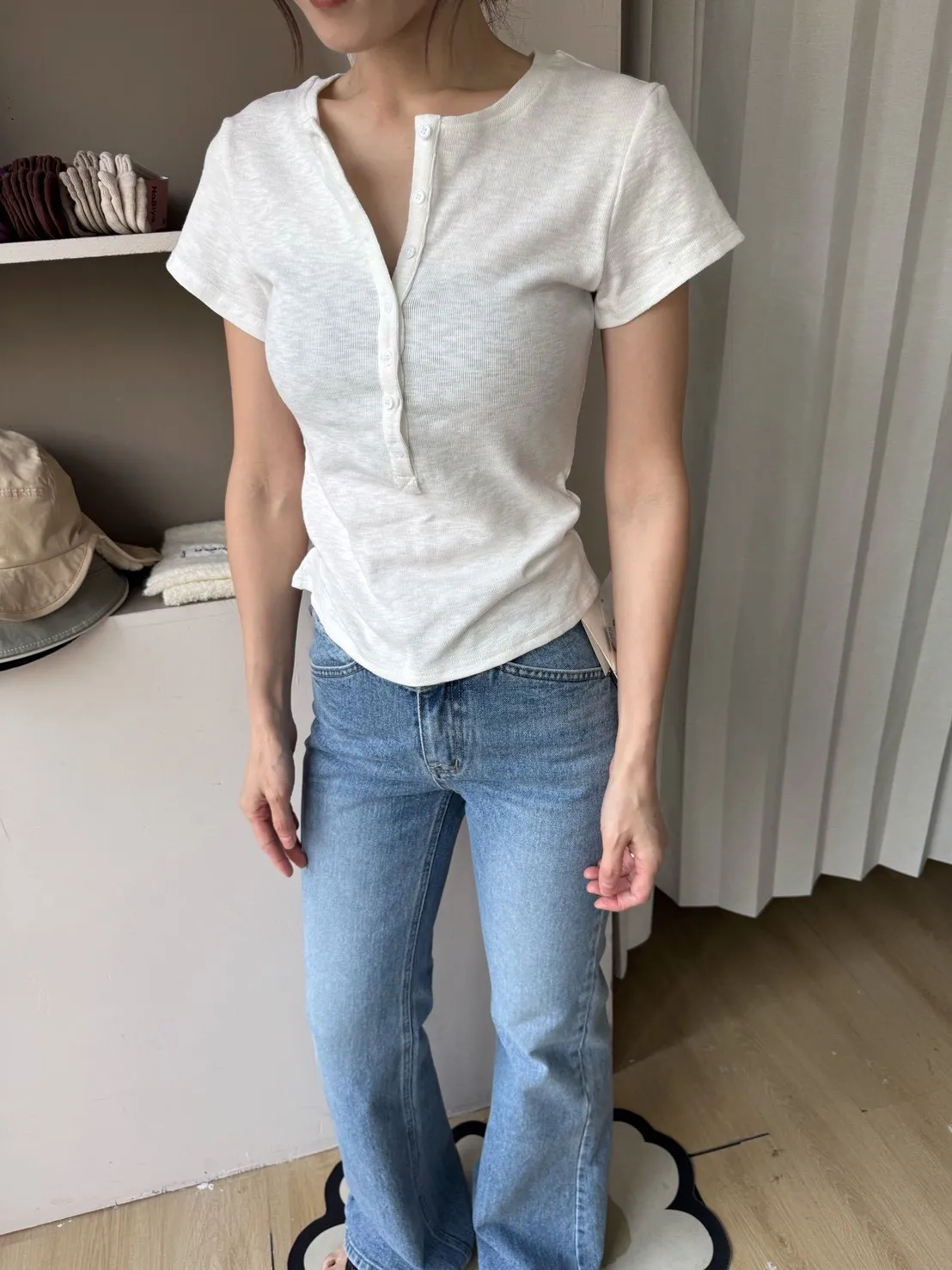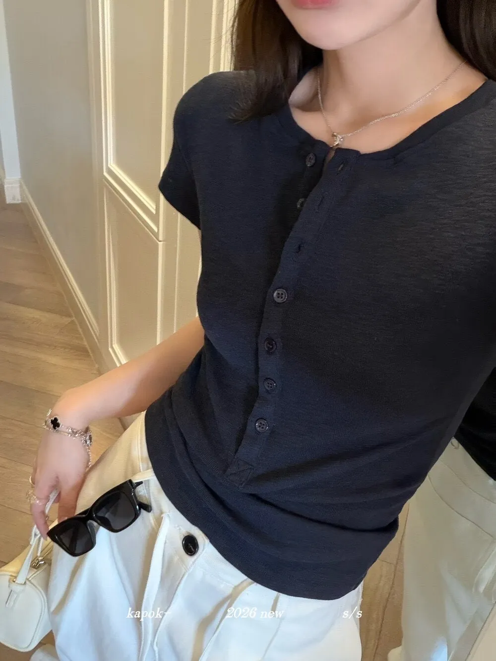 韓系正肩百搭修身半開扣短袖T恤