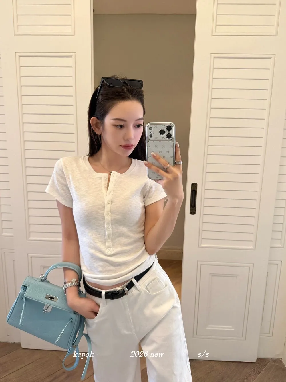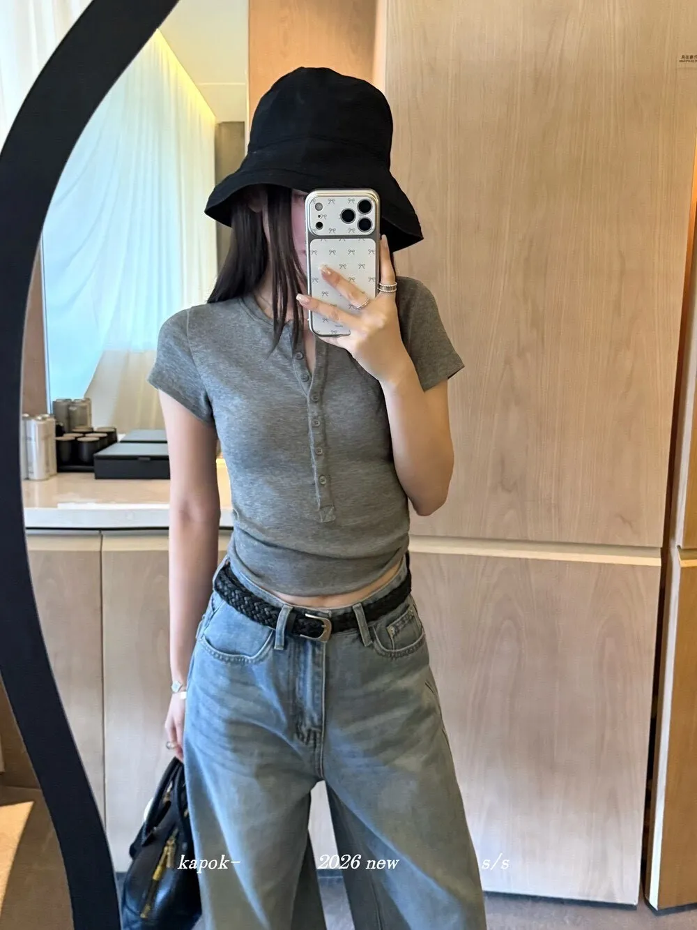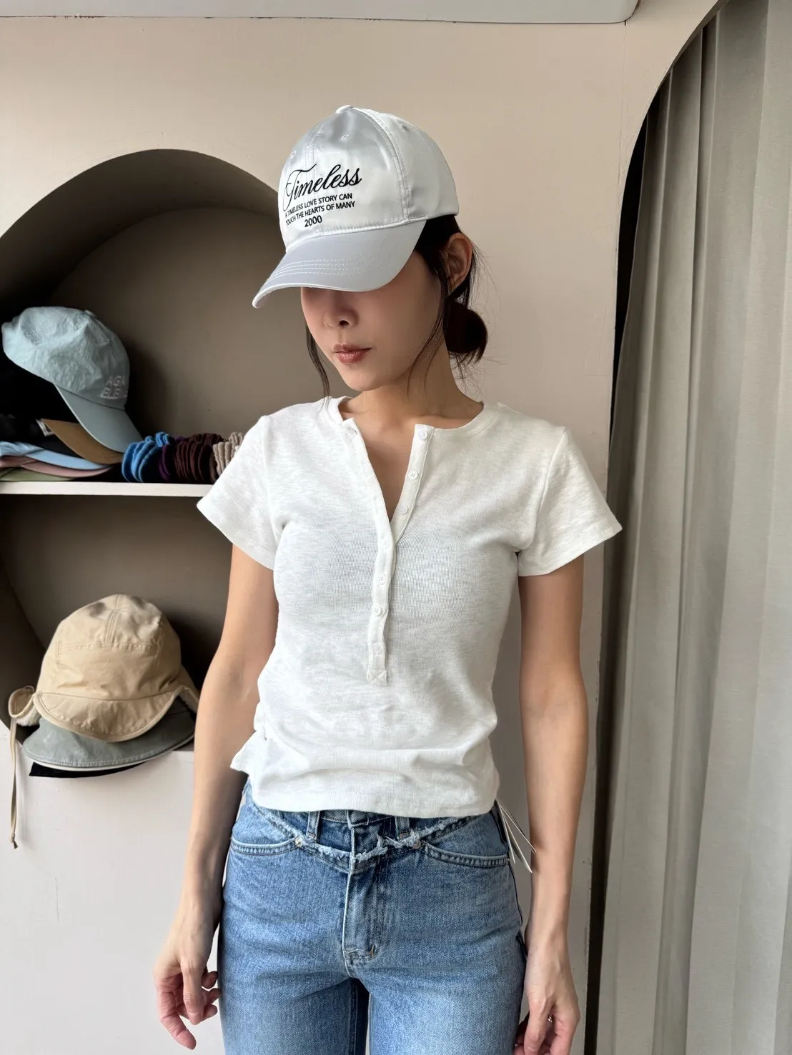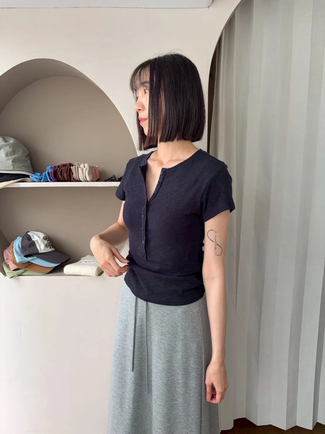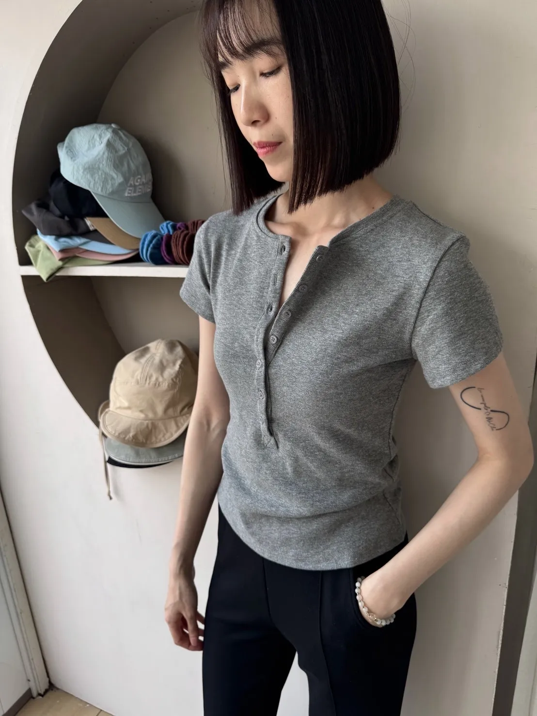 韓系正肩百搭修身半開扣短袖T恤