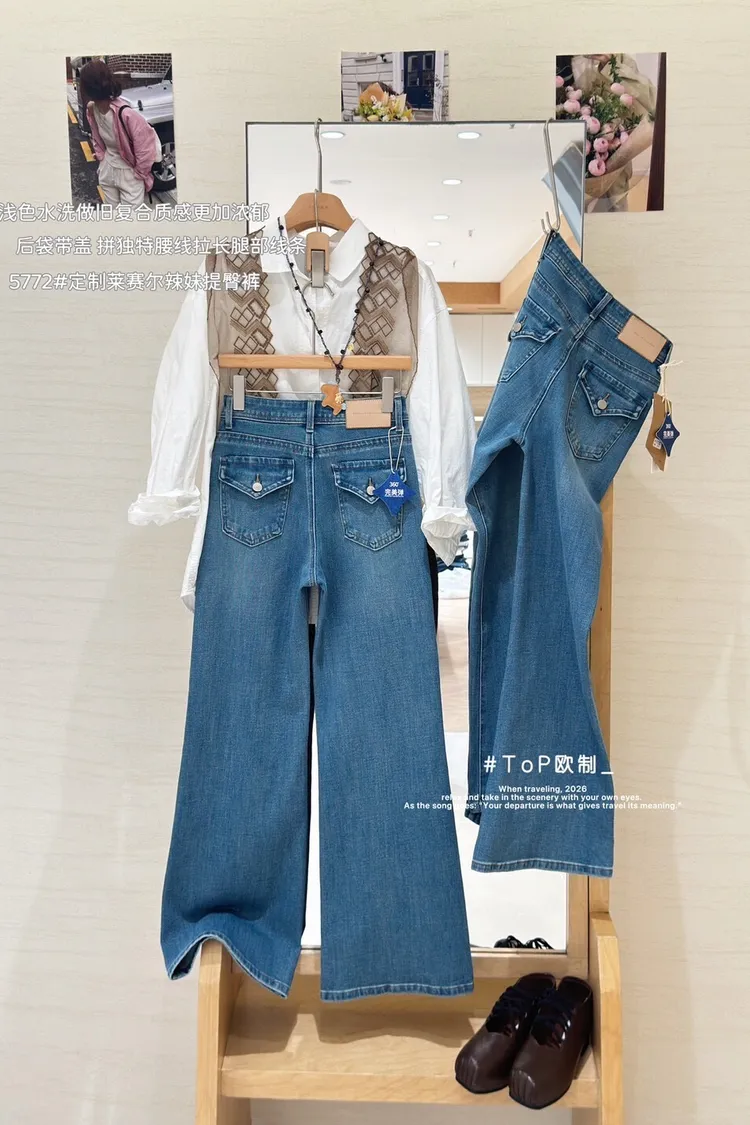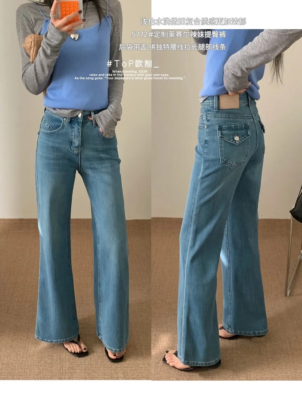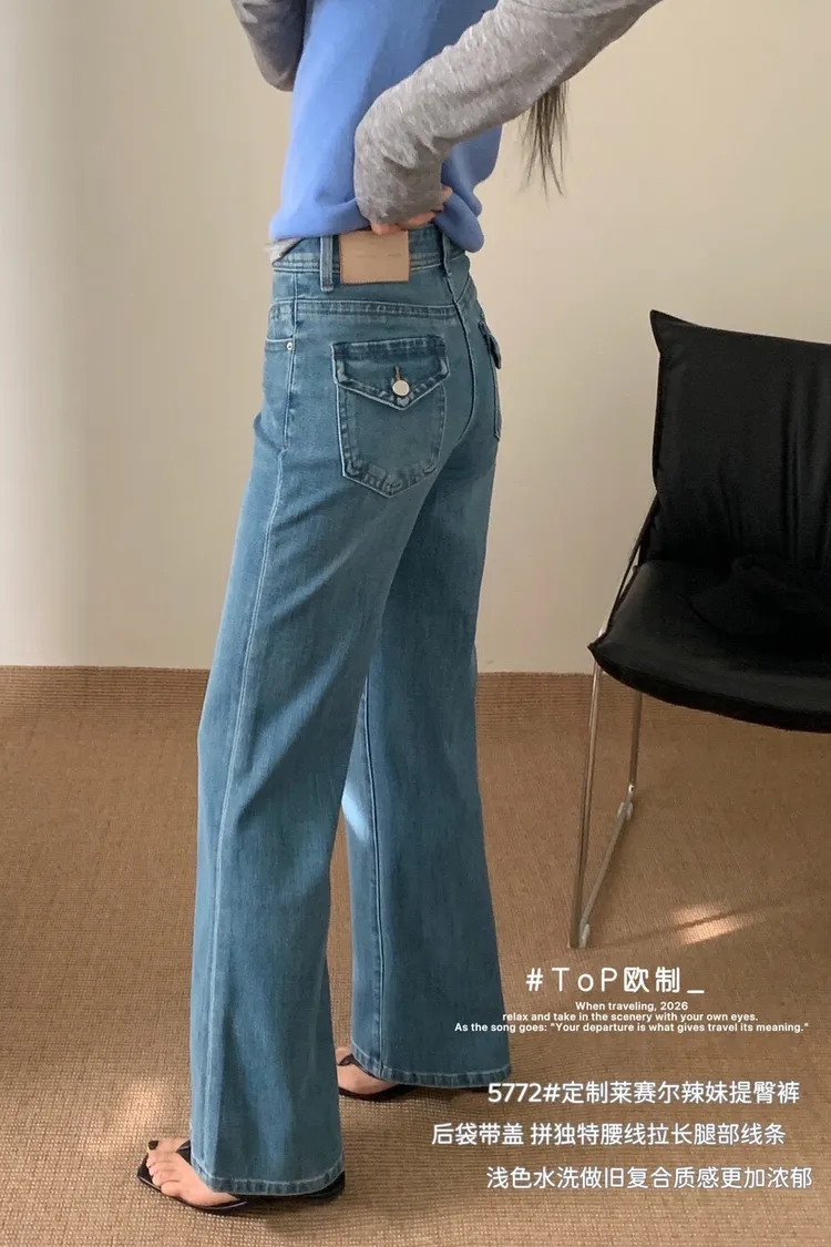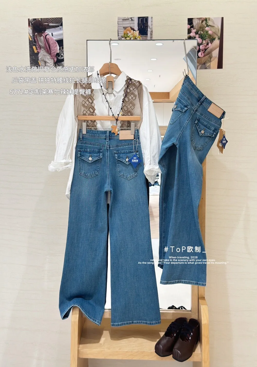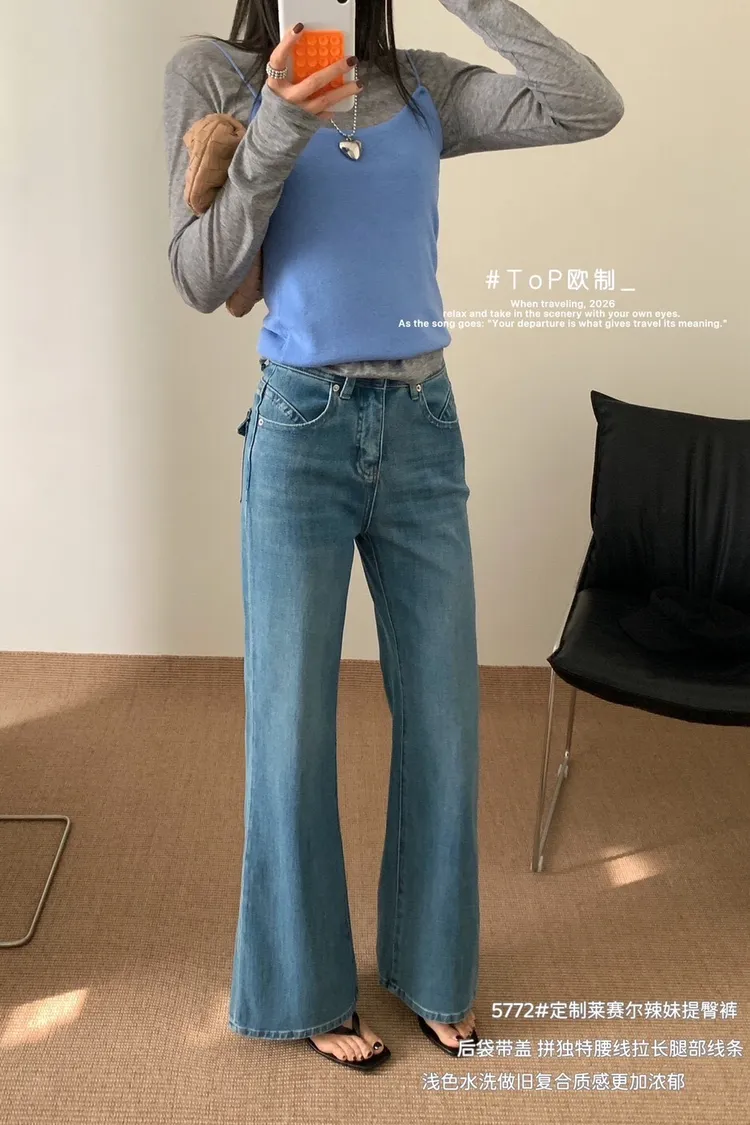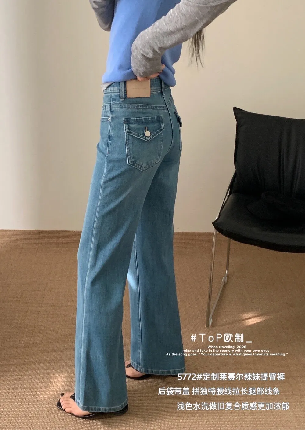 萊賽爾韓版後袋帶蓋拼獨特腰線拉長腿部線條淺色水洗做舊喇叭褲