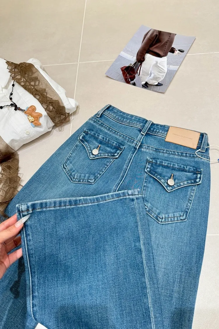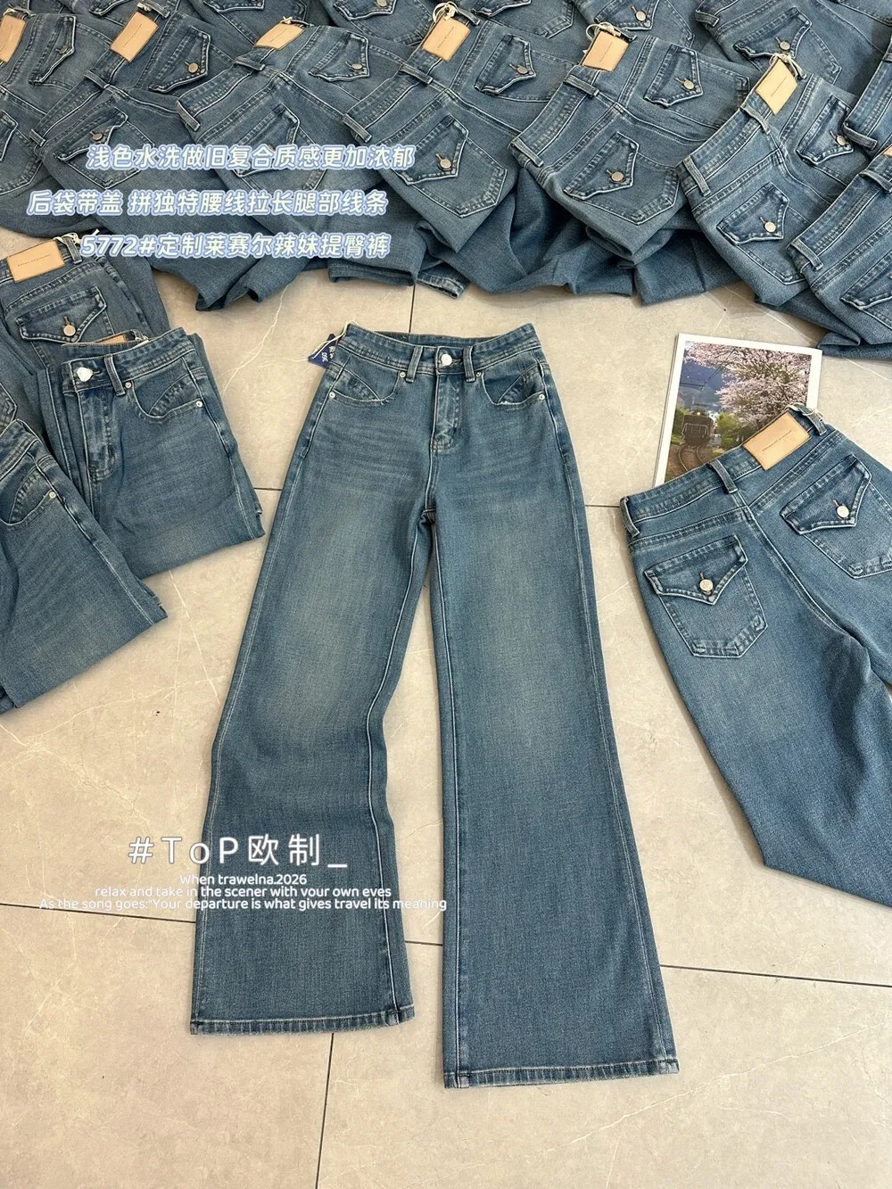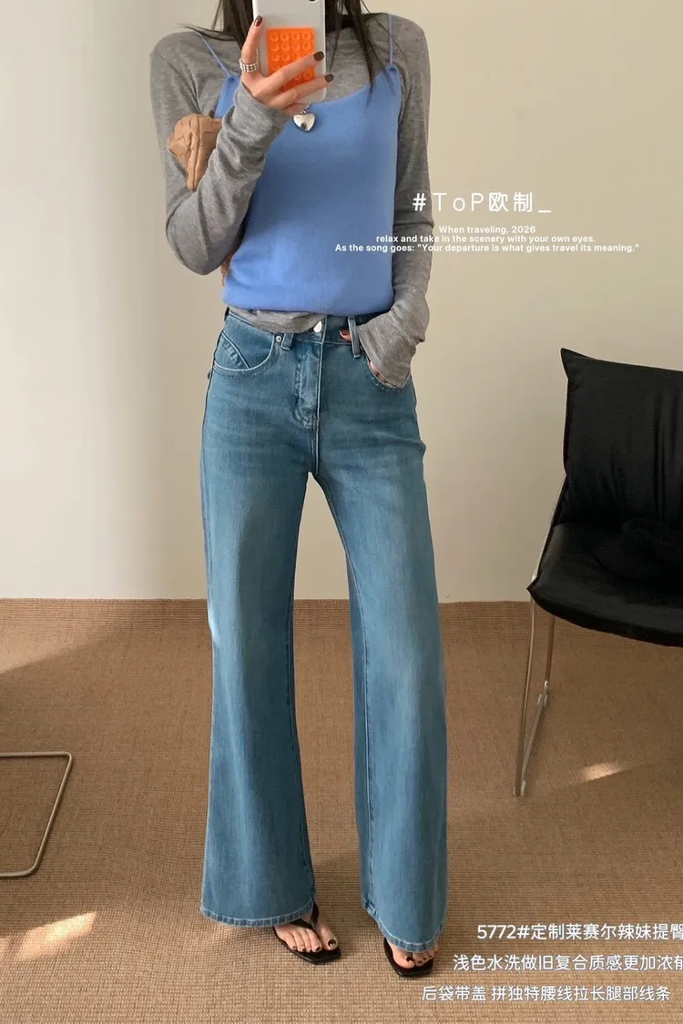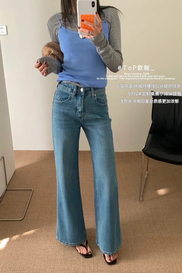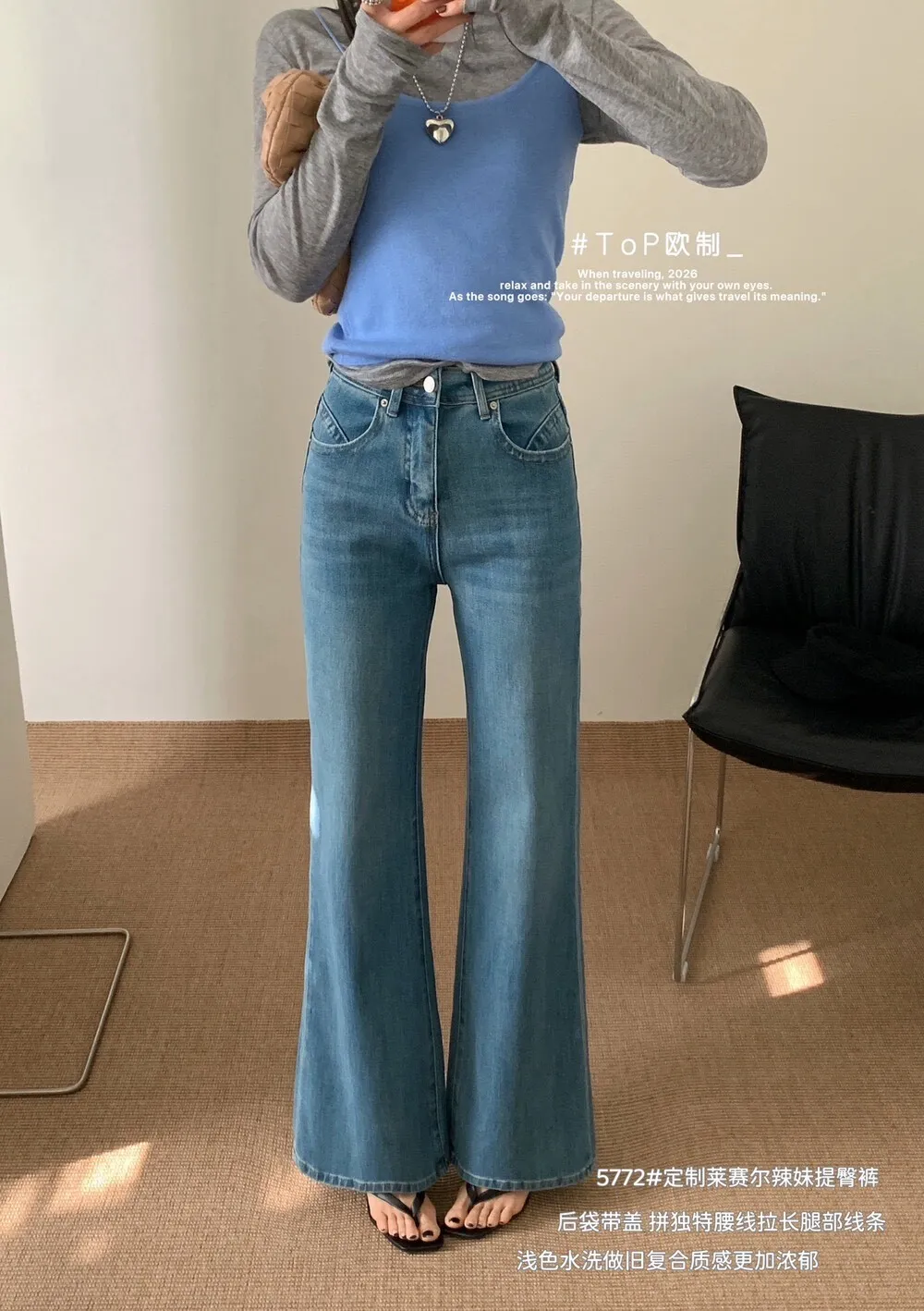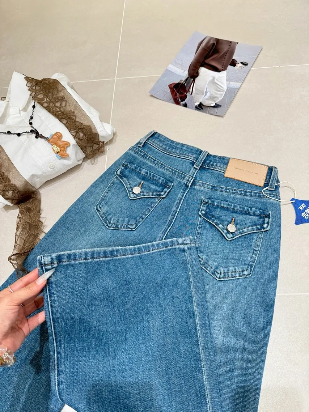 萊賽爾韓版後袋帶蓋拼獨特腰線拉長腿部線條淺色水洗做舊喇叭褲