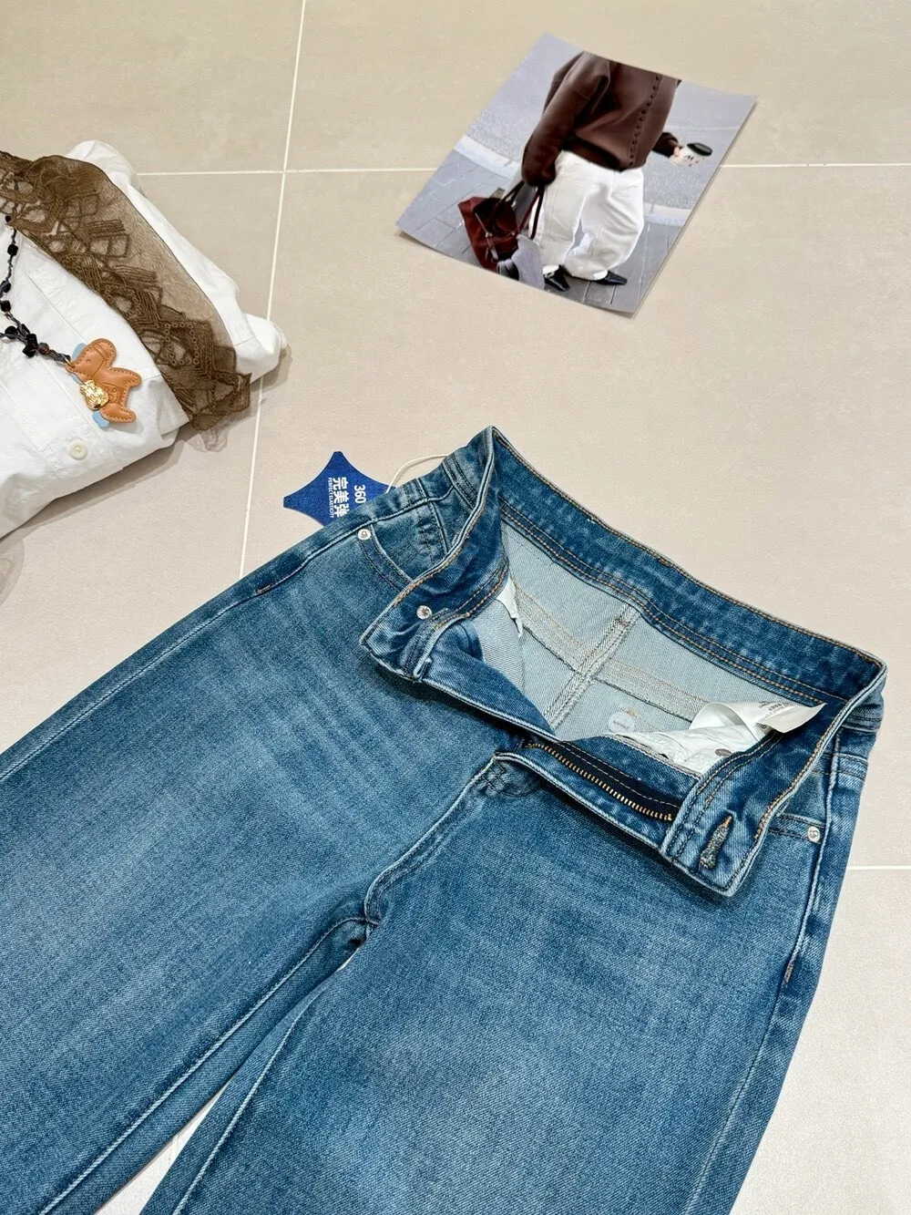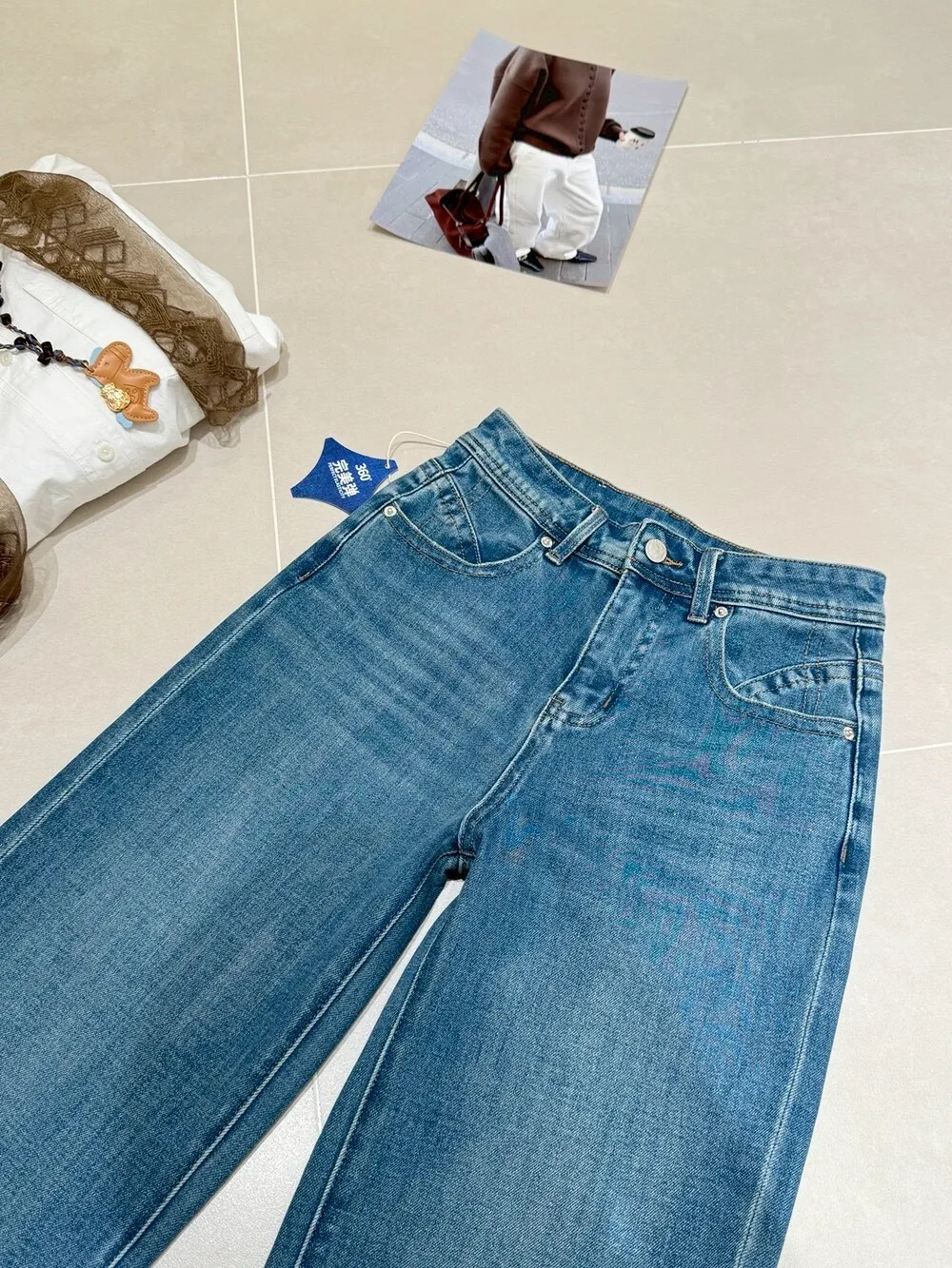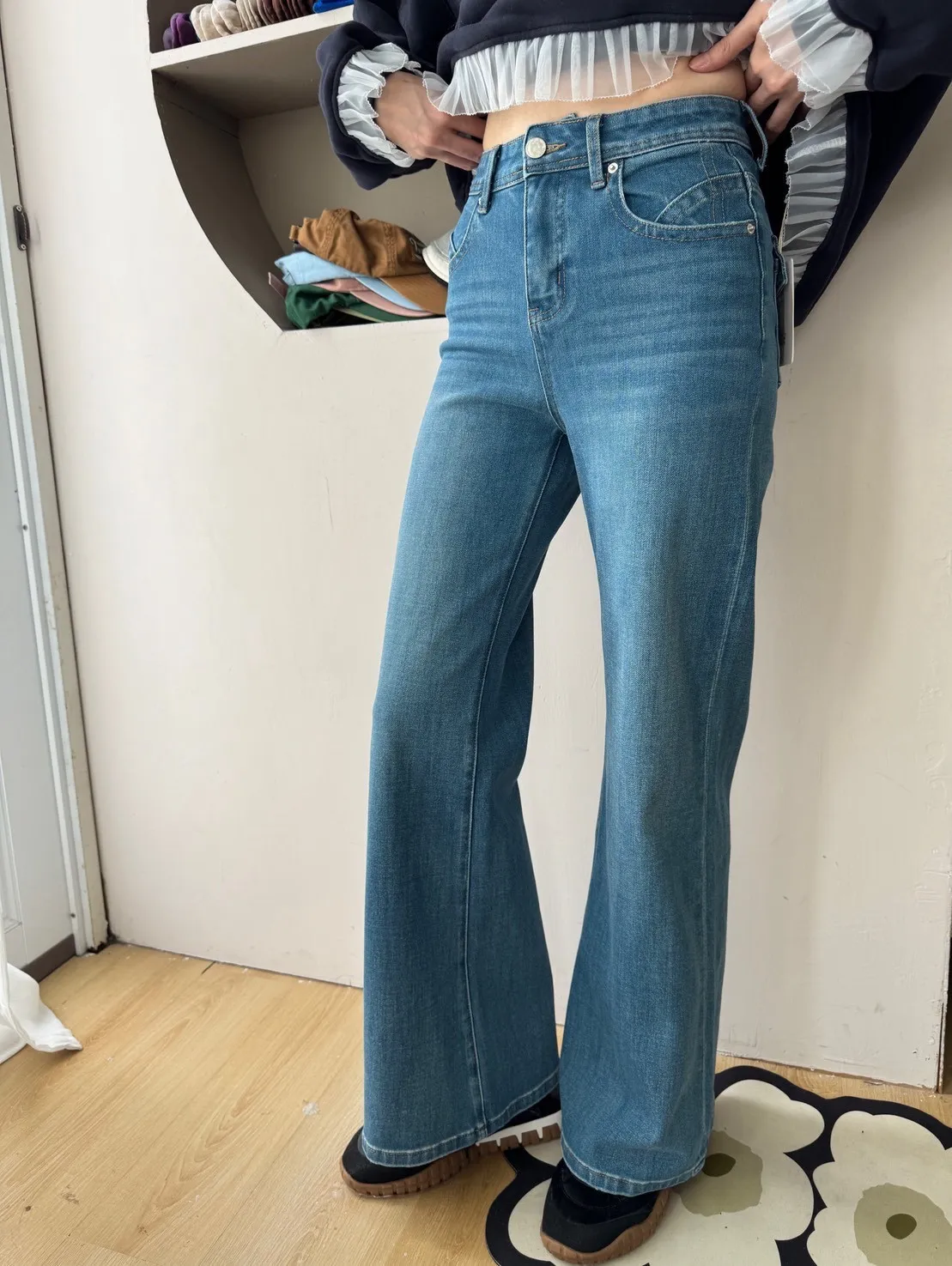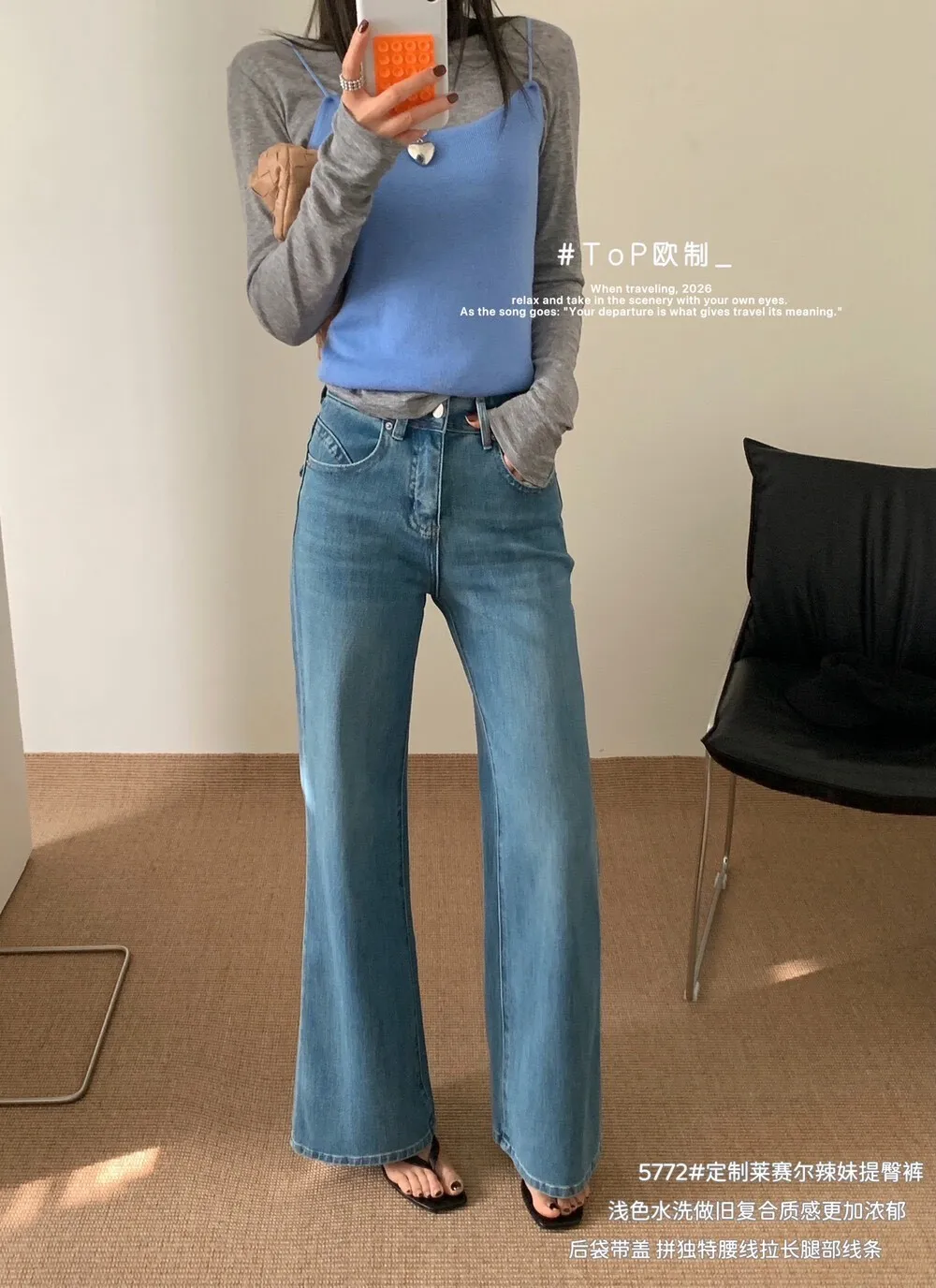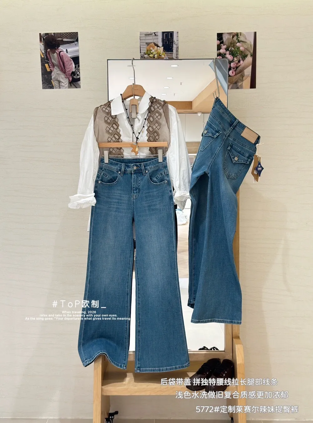 萊賽爾韓版後袋帶蓋拼獨特腰線拉長腿部線條淺色水洗做舊喇叭褲
