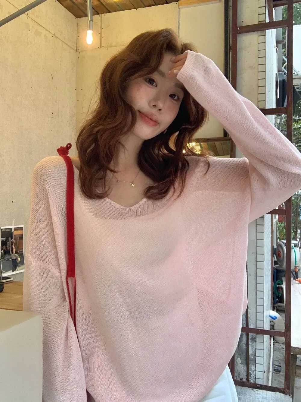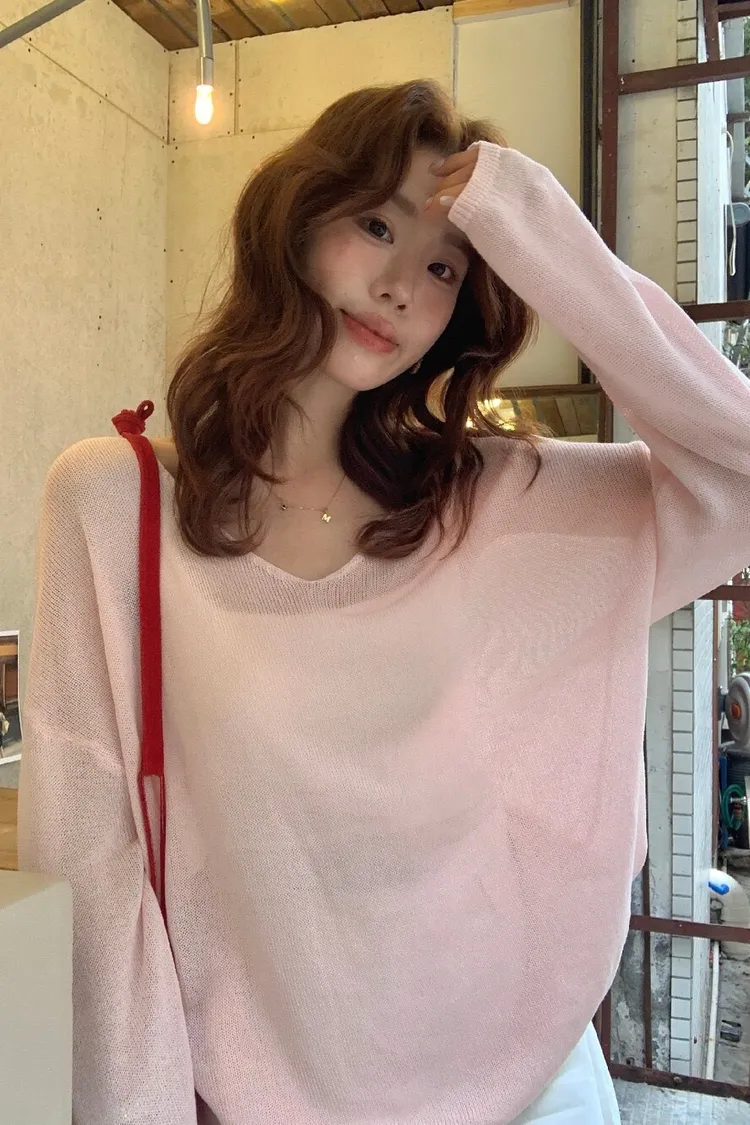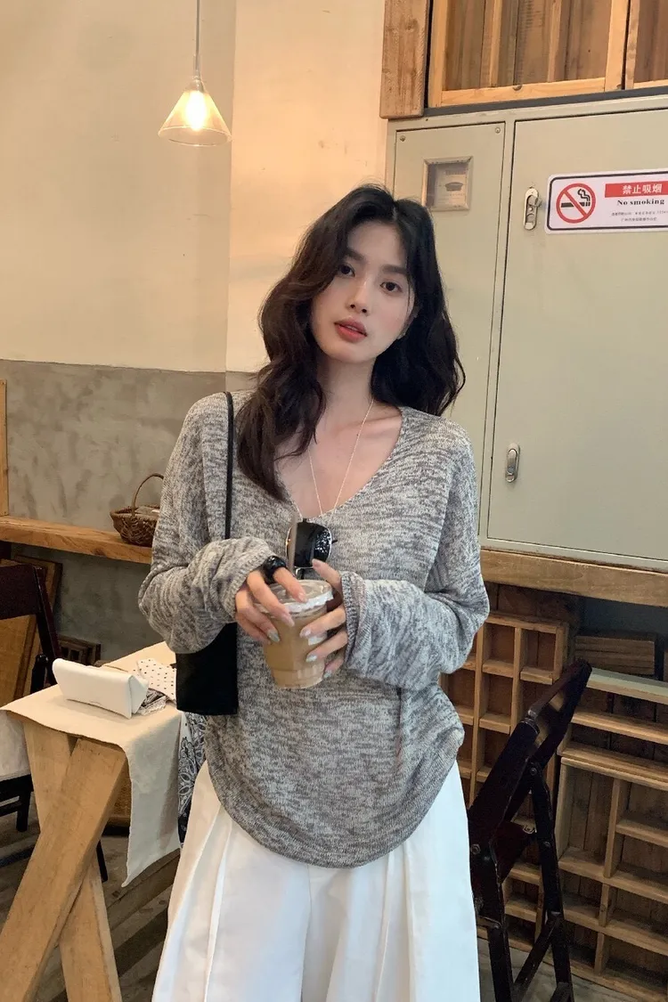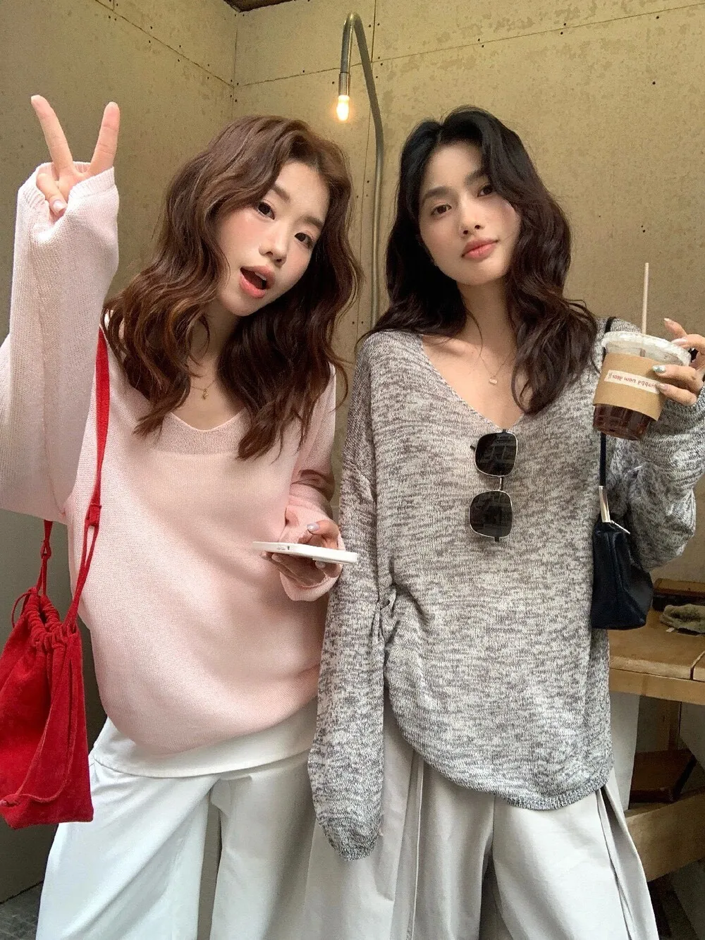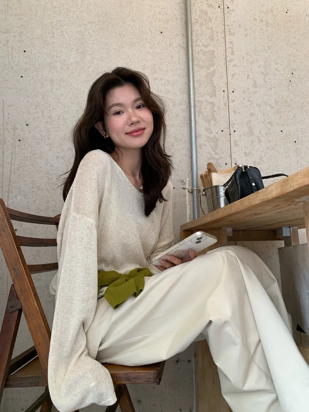 版型Ju顯瘦~溫柔慵懶V領寬松套頭針織衫
