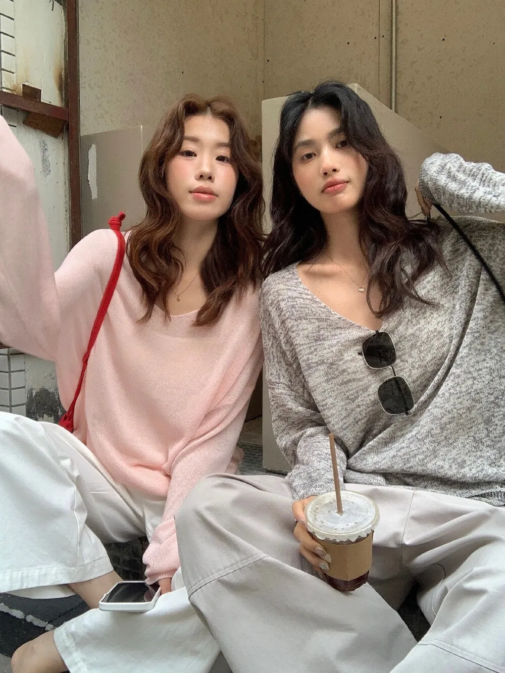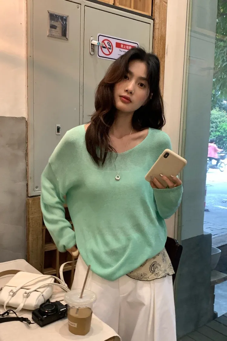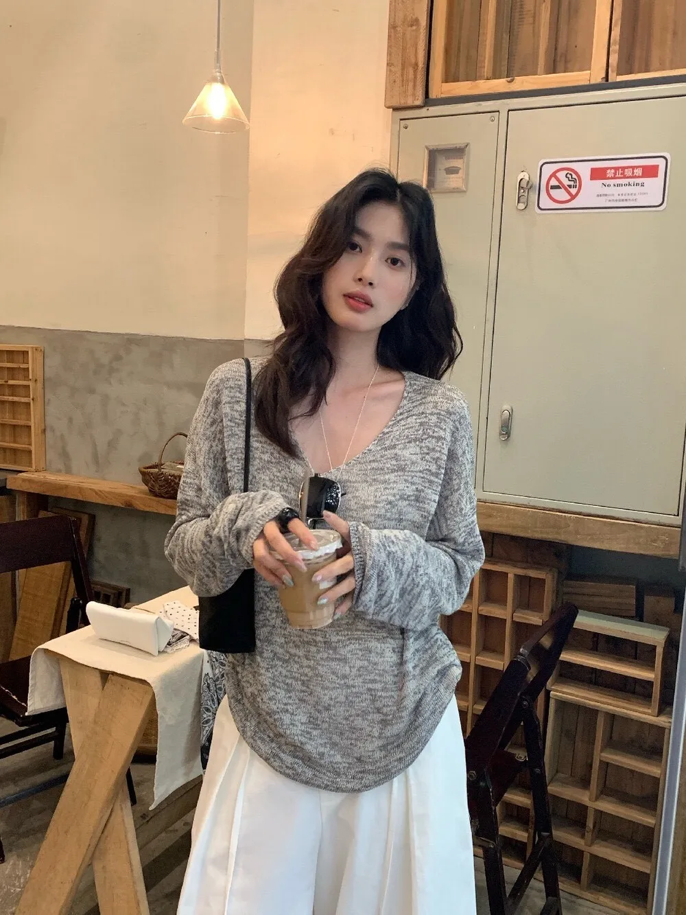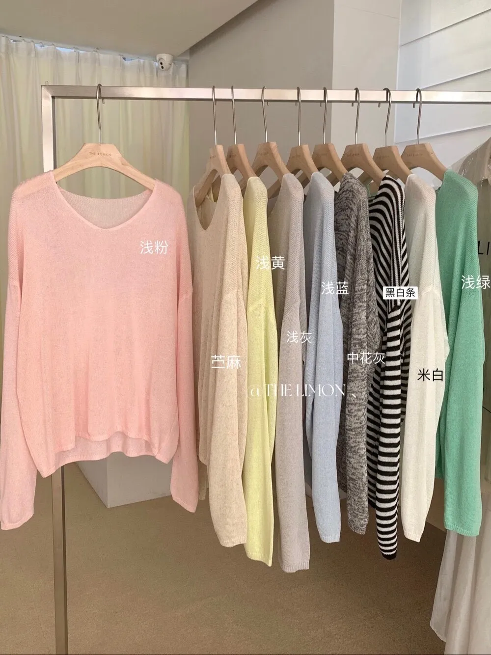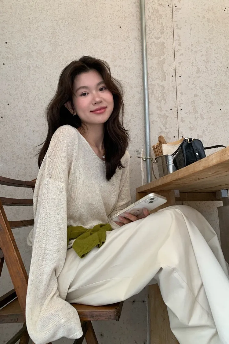 版型Ju顯瘦~溫柔慵懶V領寬松套頭針織衫