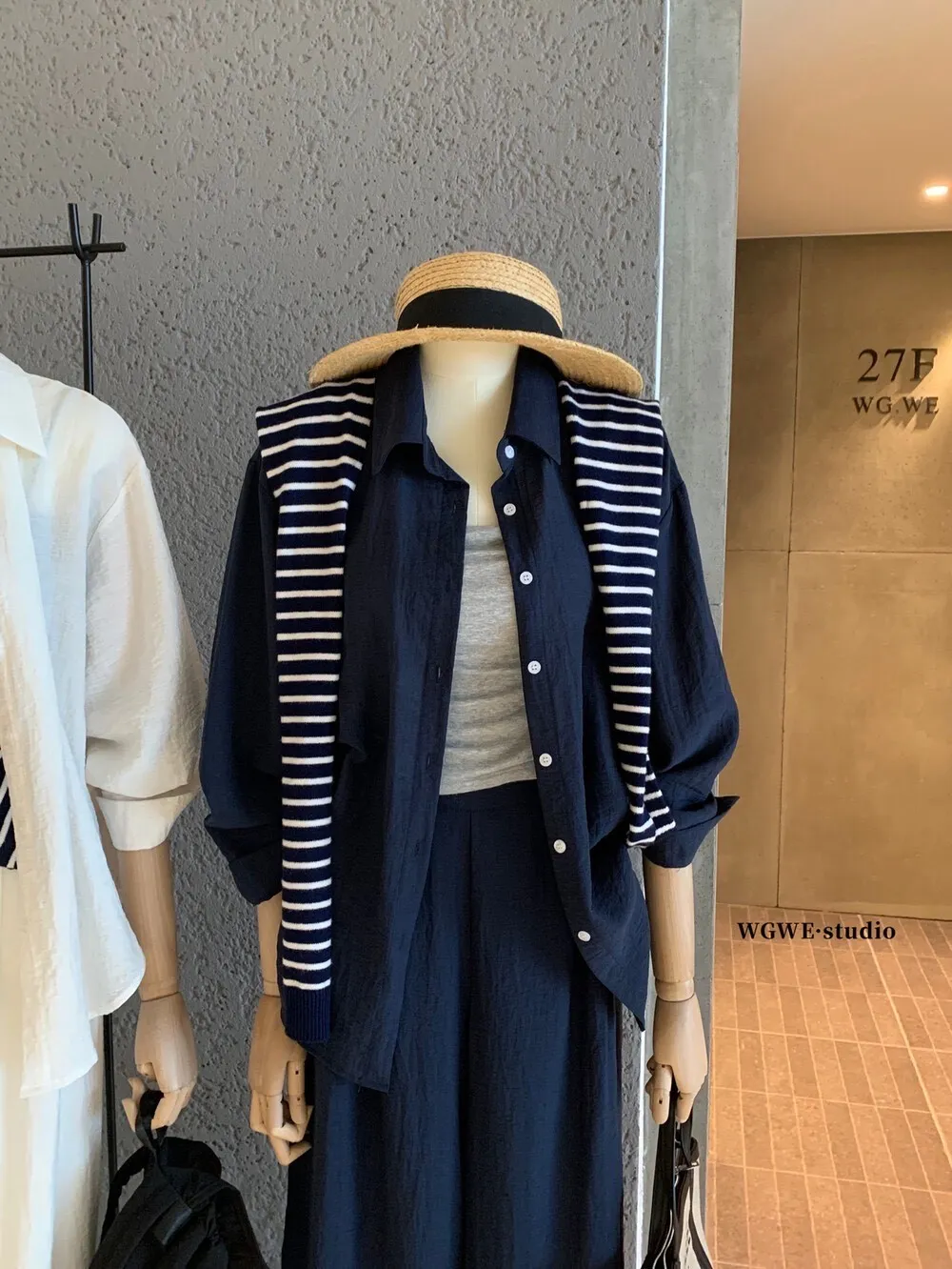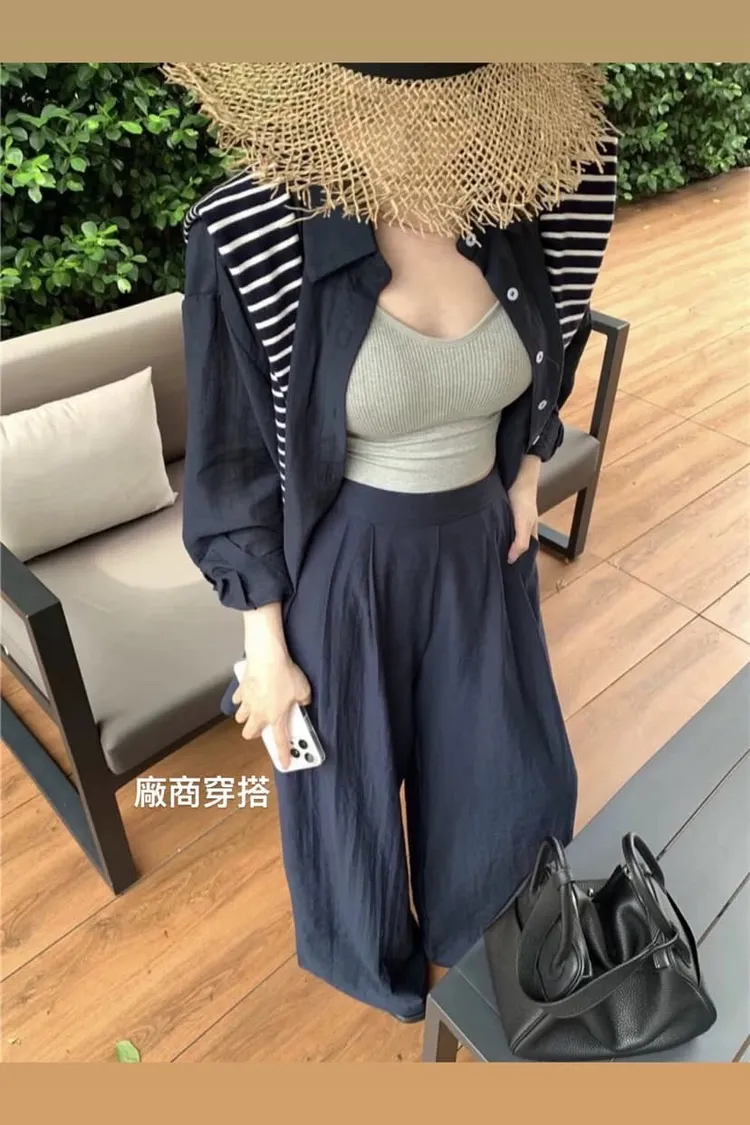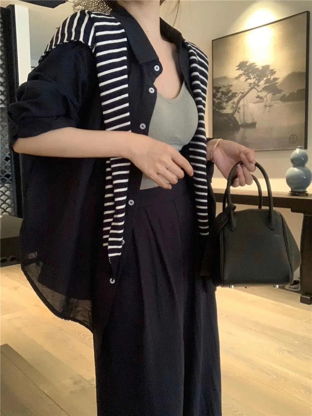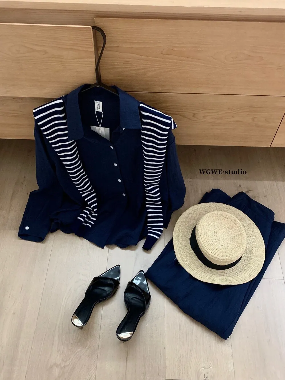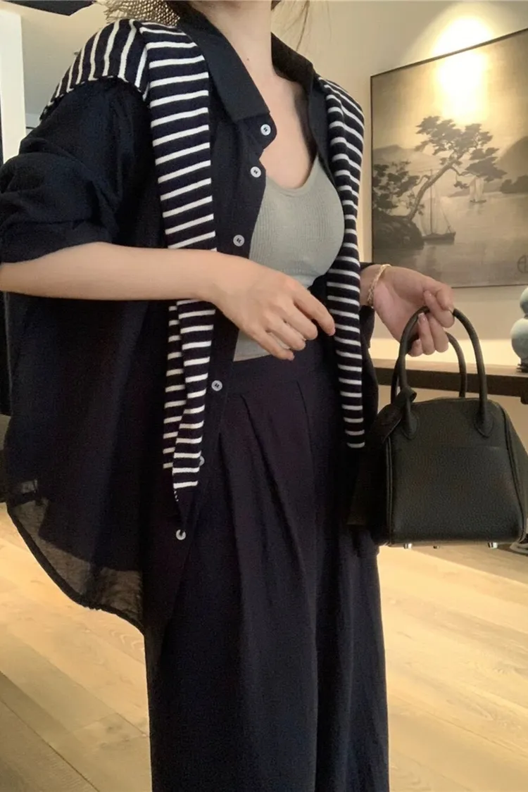 拼接條紋披肩襯衣寬松休閒百搭上衣襯衫+休閒褲套裝(配披肩)