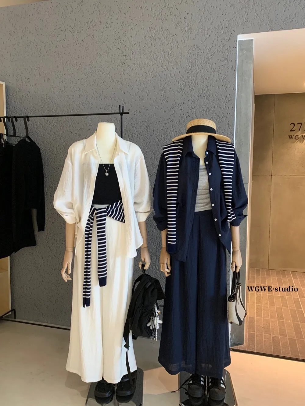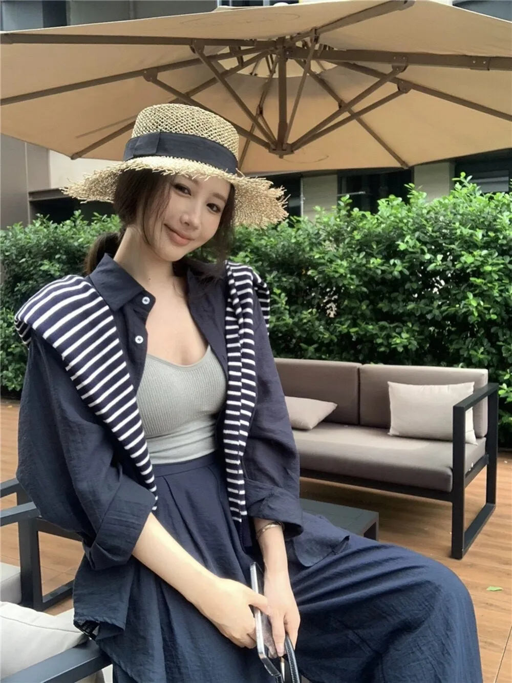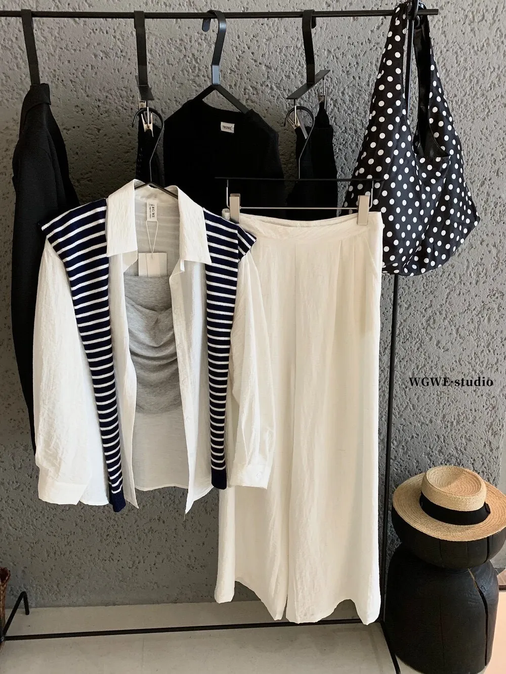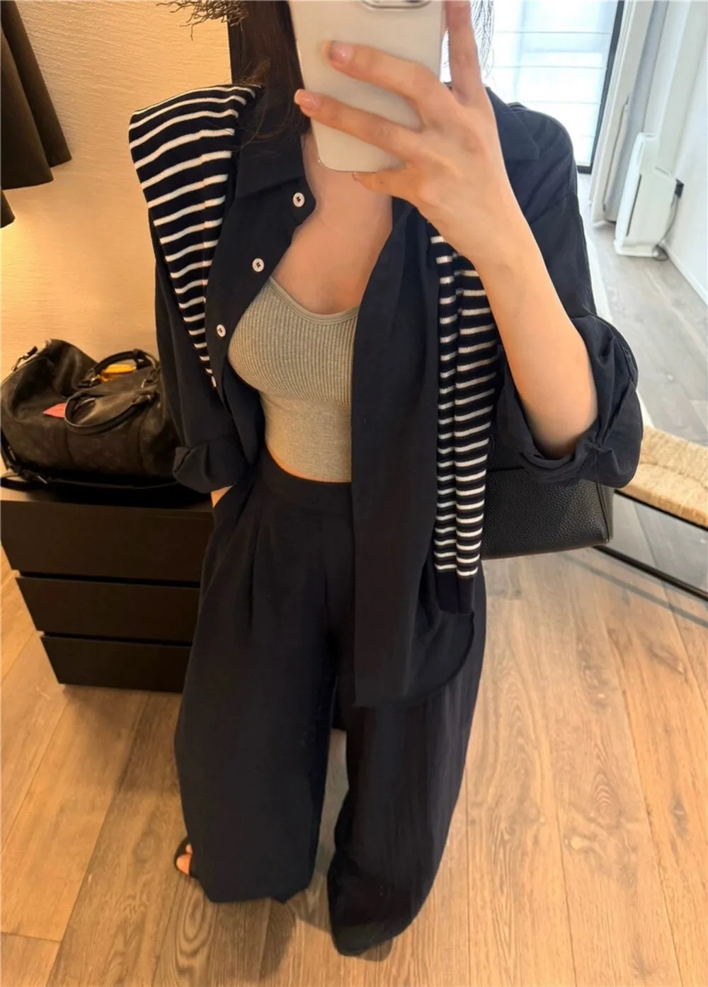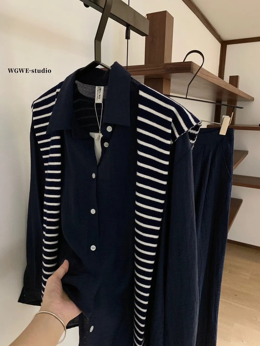 拼接條紋披肩襯衣寬松休閒百搭上衣襯衫+休閒褲套裝(配披肩)