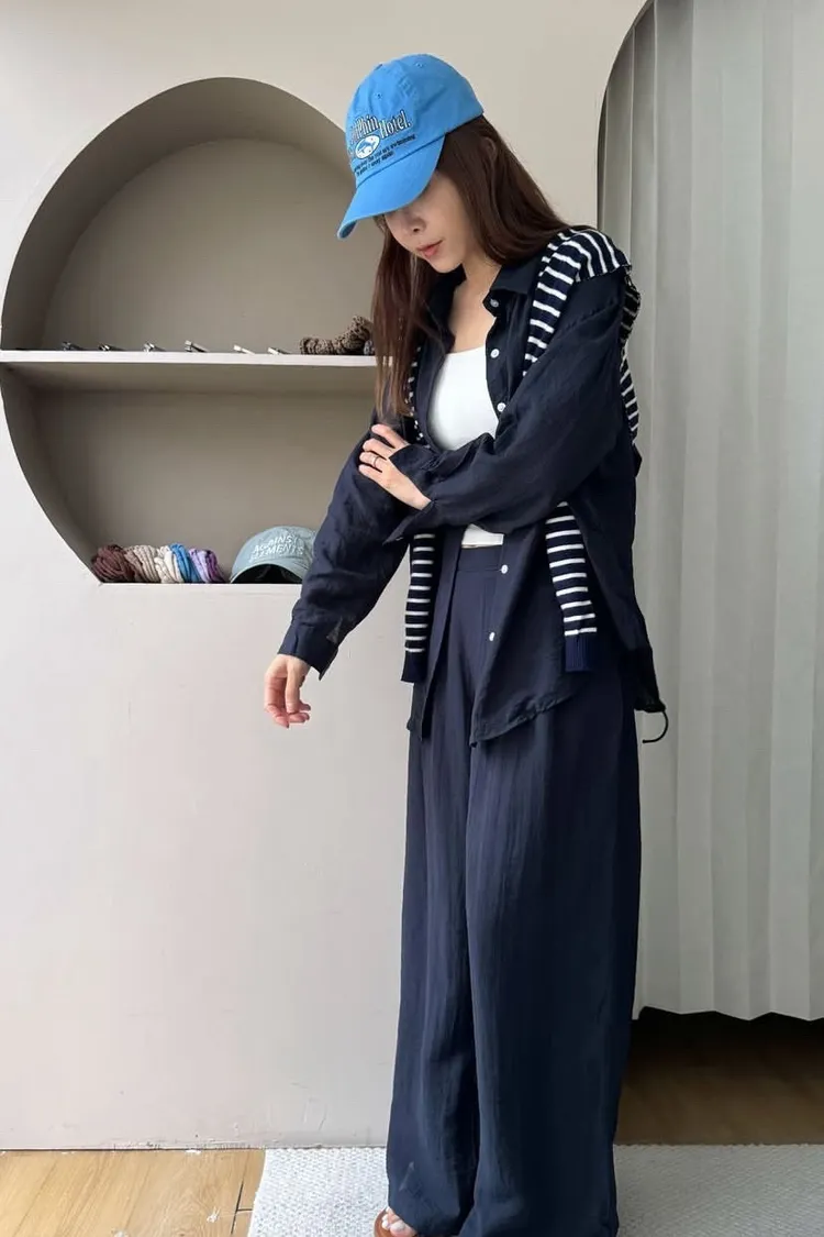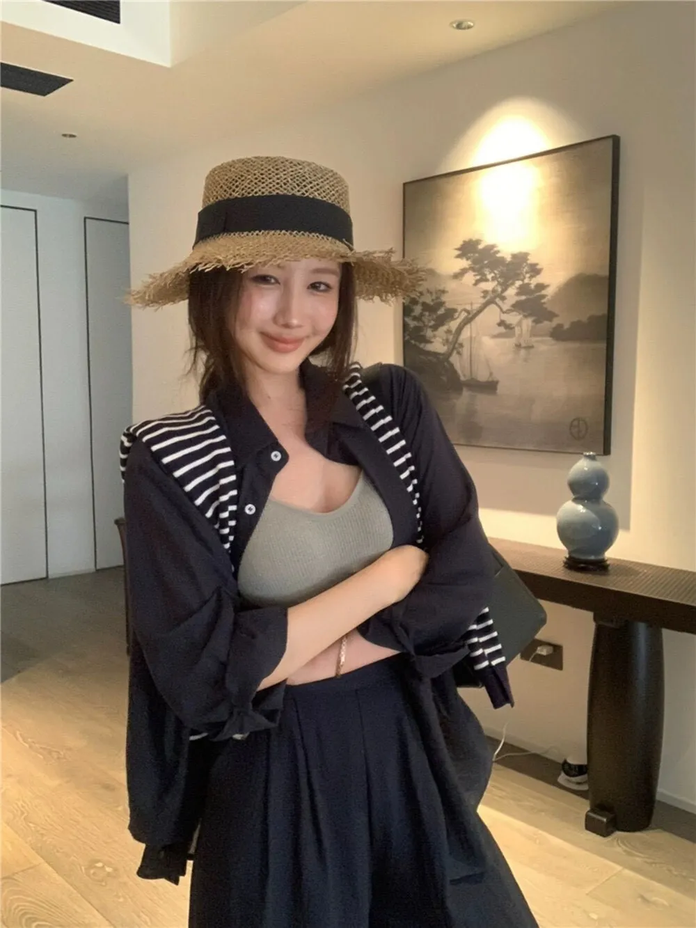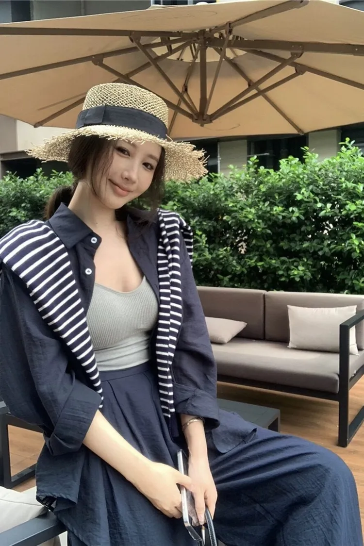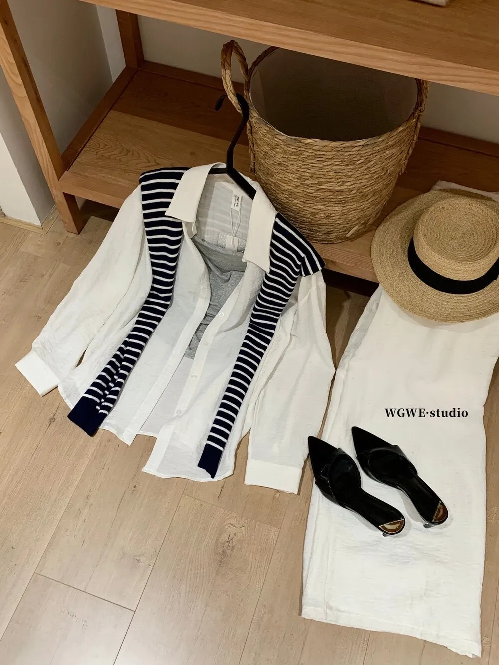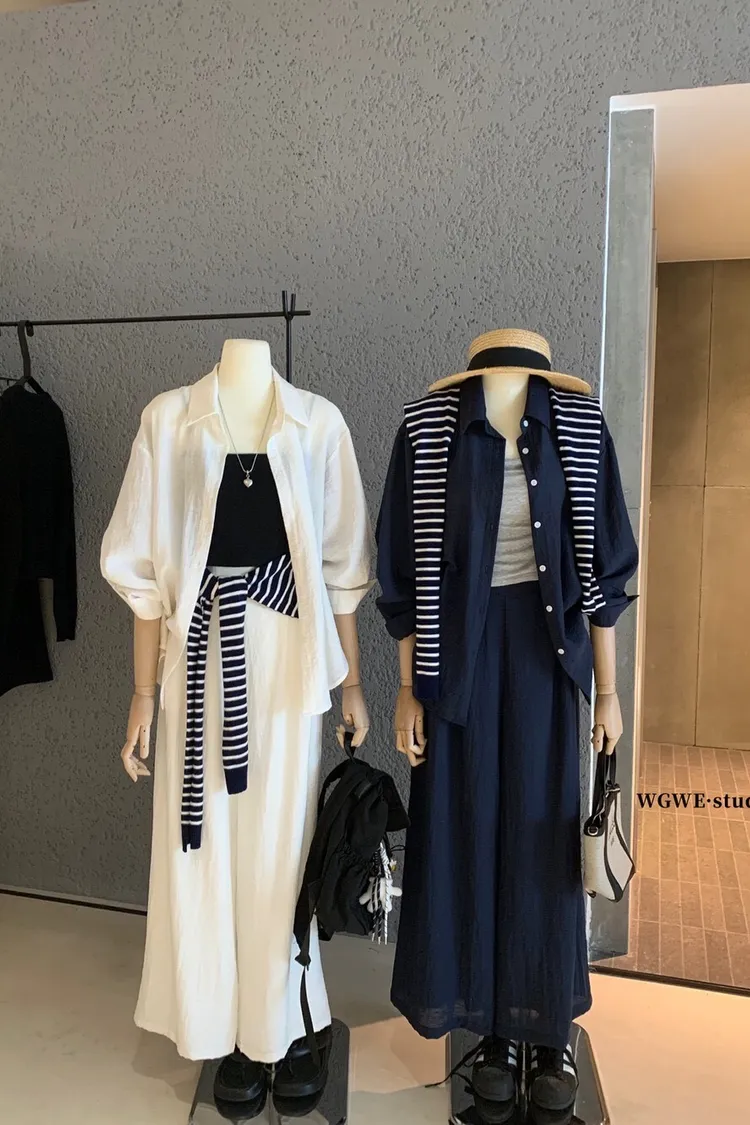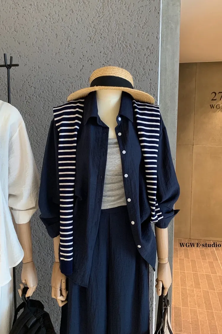 拼接條紋披肩襯衣寬松休閒百搭上衣襯衫+休閒褲套裝(配披肩)