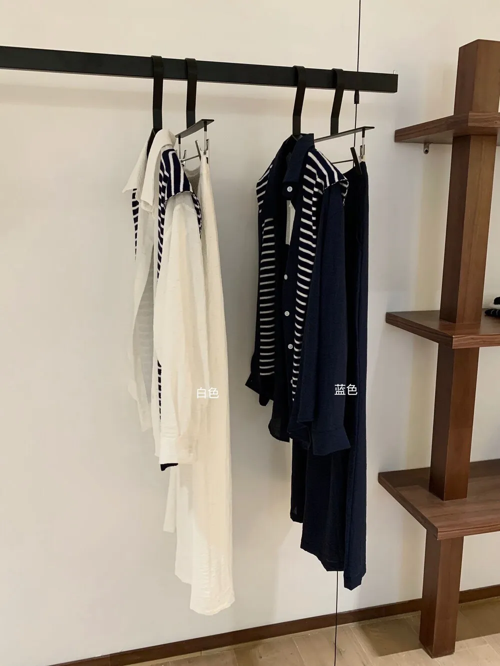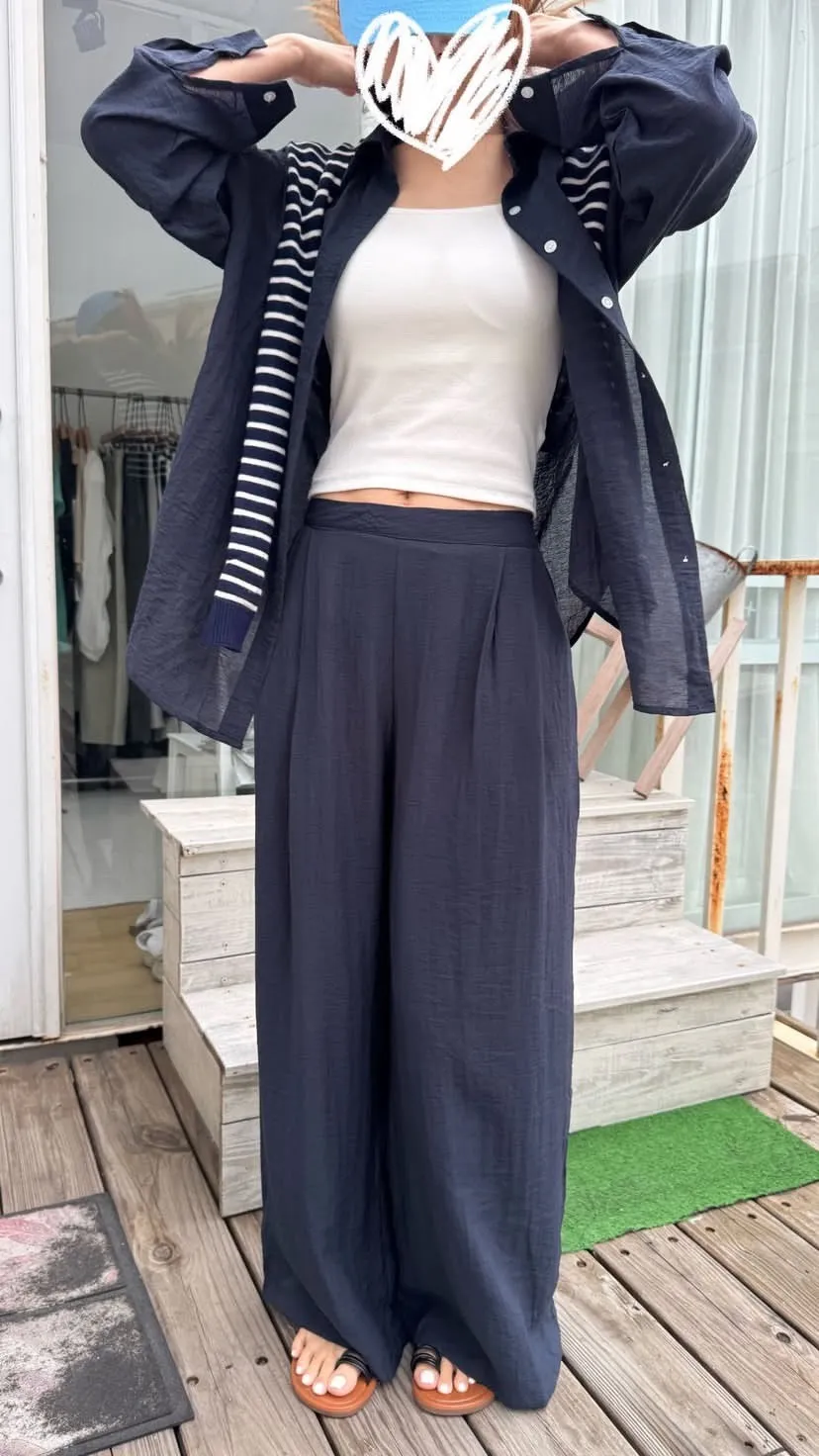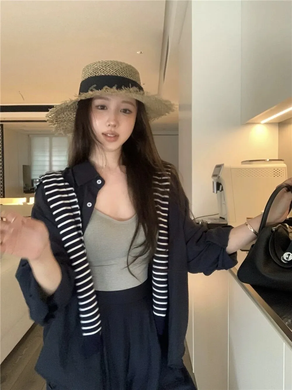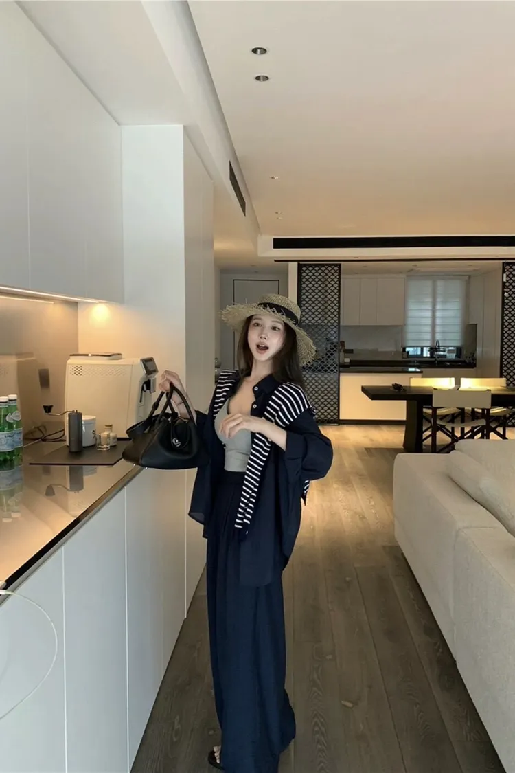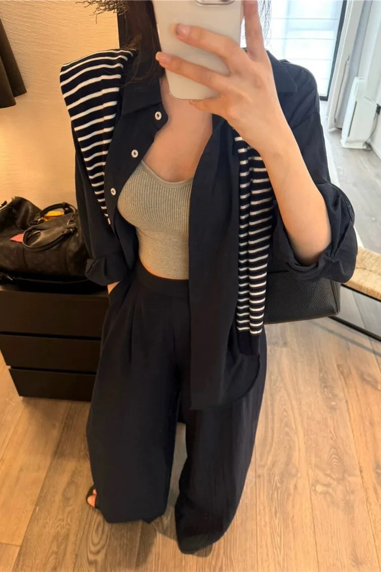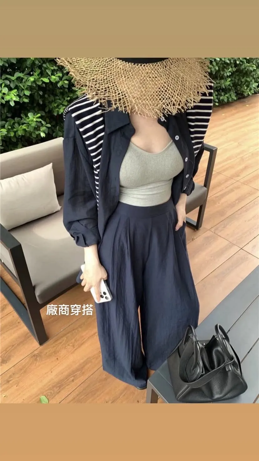 拼接條紋披肩襯衣寬松休閒百搭上衣襯衫+休閒褲套裝(配披肩)